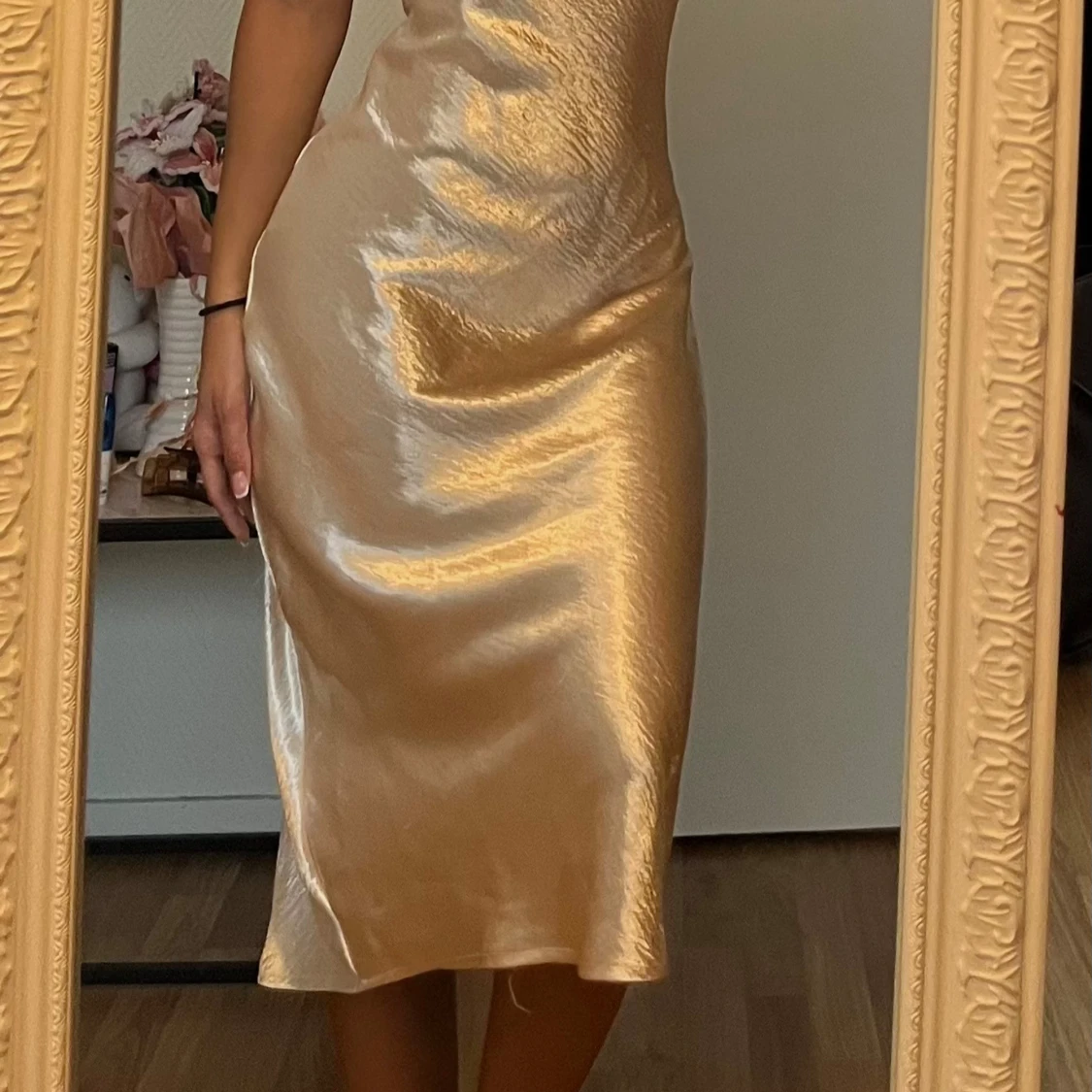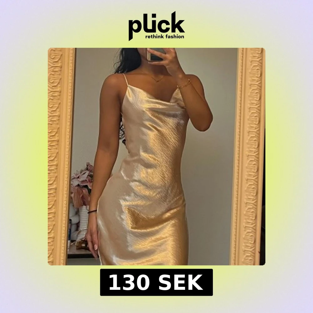 Säljer en champagnefärgad långklänning i glansig satin med smala axelband och öppen rygg. Klänningen har en snygg draperad halsringning och figurnära passform