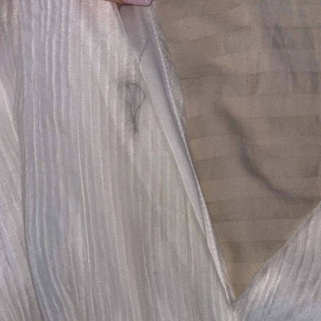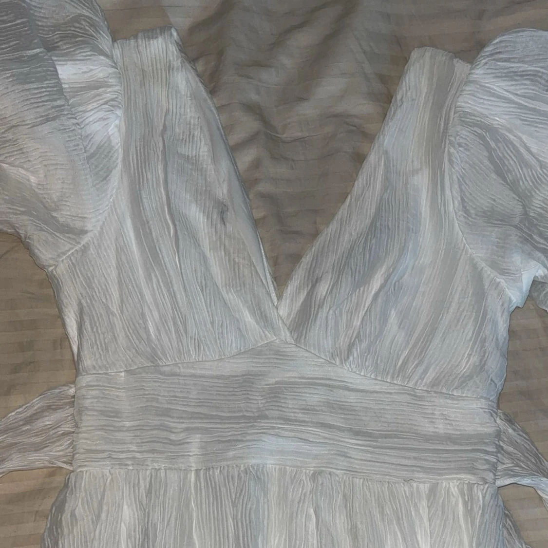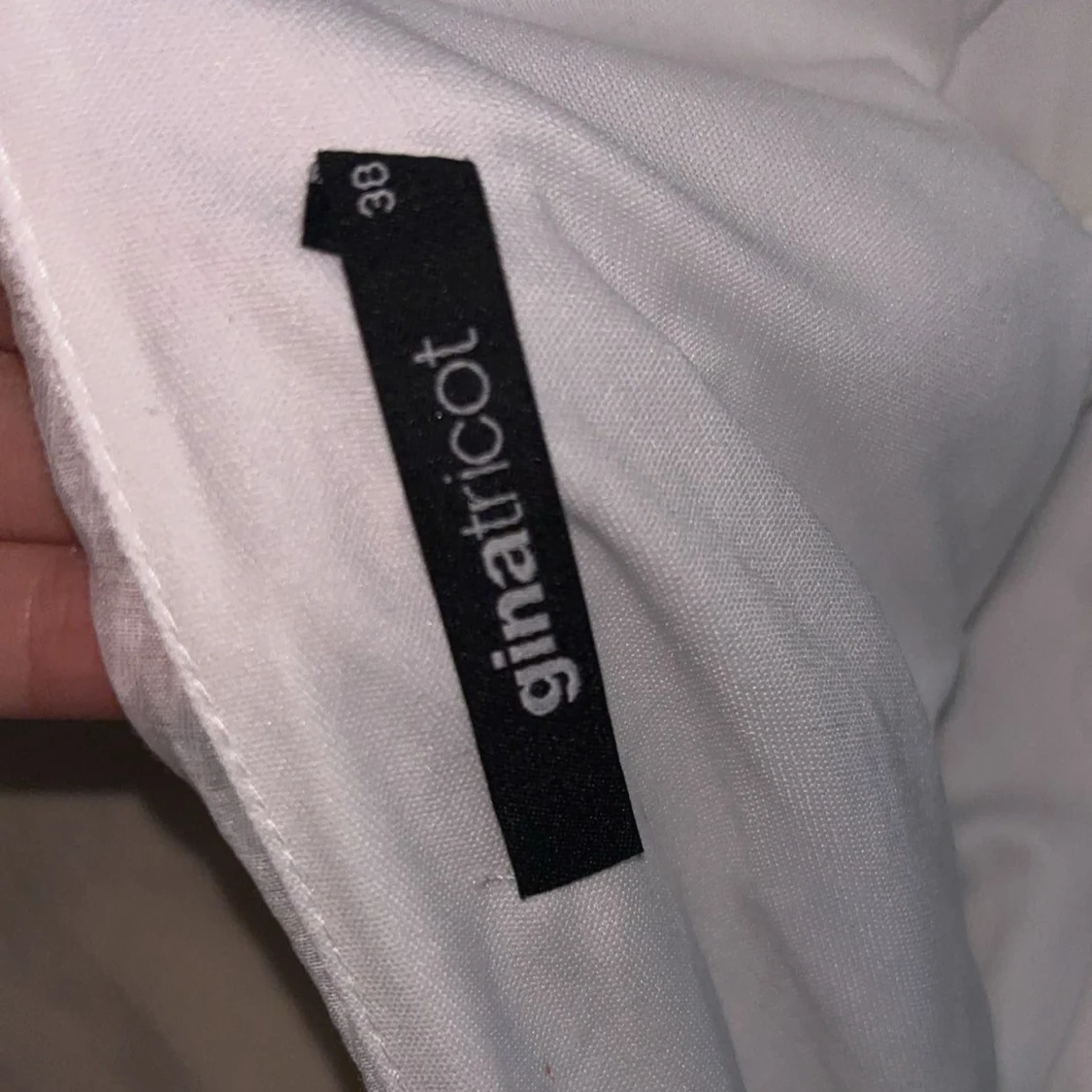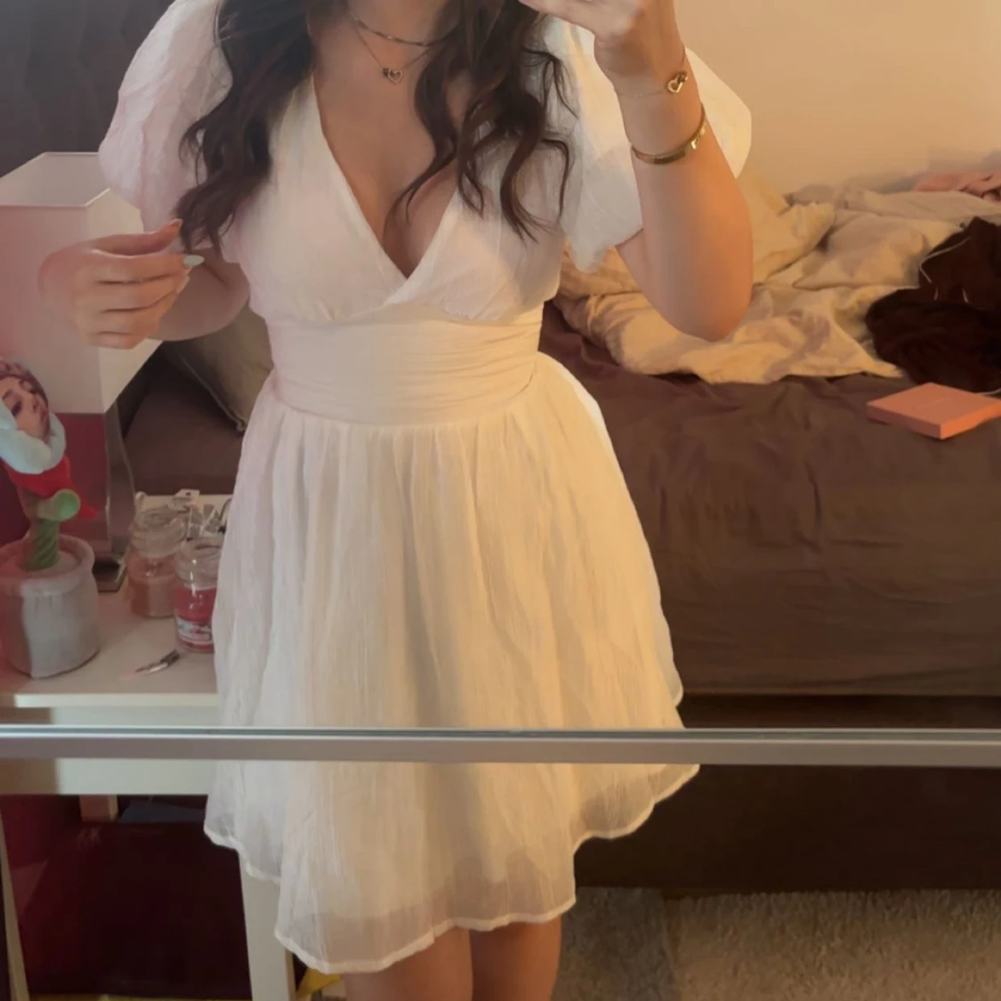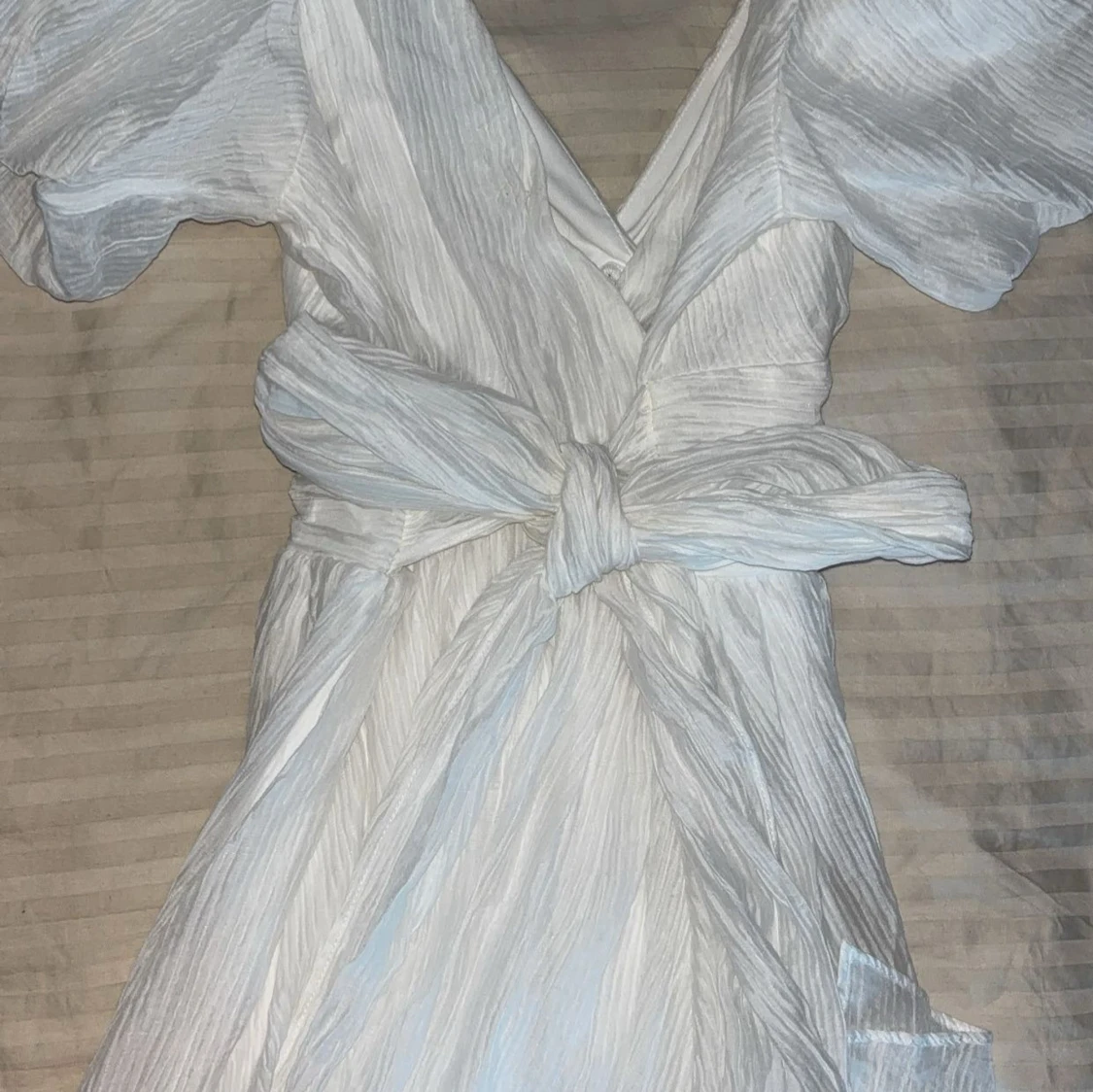 Supersöt vit kortklänning från Gina Tricot med omlott och v-ringning. Den har bara används 1 gång. Vid bröstet är det en liten svart tråd inuti kläningen som knappt syns. Det står även att den är i storlek 38 men på prislappen stod det 36 och passformen är även som en storlek 36! Ord pris 699.