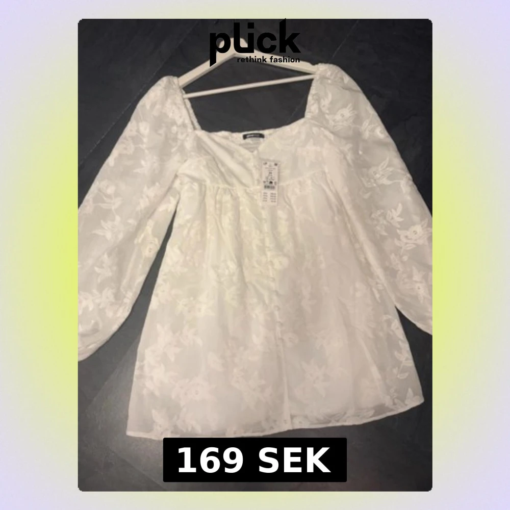 Supersöt vit student klänning från Gina Tricot med blommigt mönster. Den är helt oanvänd och har prislappen kvar. Klänningen har puffiga långärmar och fyrkantig ringning. Perfekt för sommarens alla tillfällen och ger en romantisk vibe.
