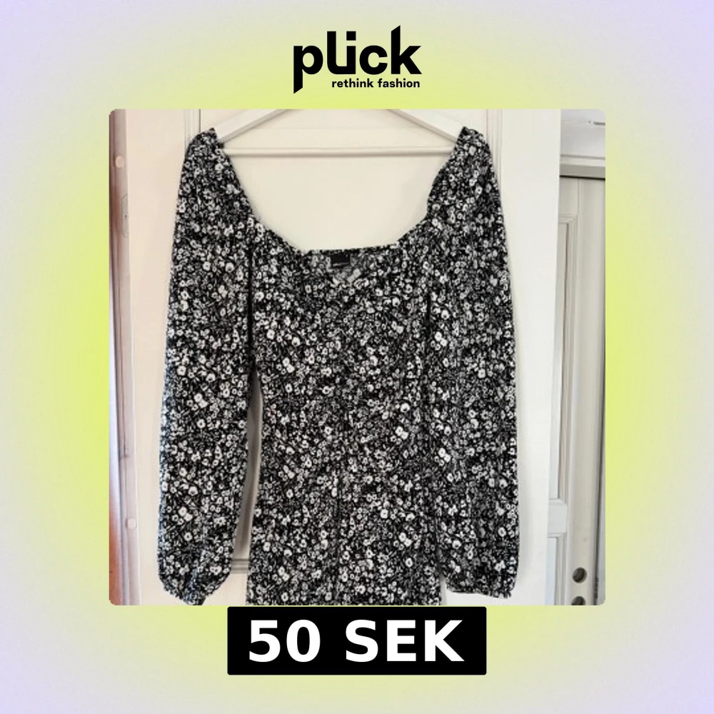 Supersöt svart klänning med vitt blommönster från ginatricot. Klänningen har långa puffärmar, v-ringning och en figurnära passform upptill. Rynkad vid bysten. Använd en gång!