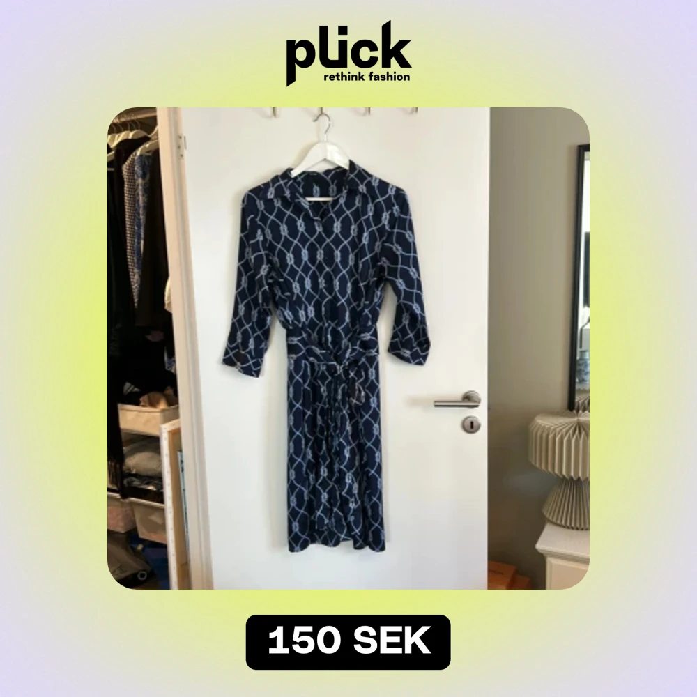 Säljer en snygg mörkblå klänning från Gina Tricot med ett unikt mönster av ljusblå rep. Klänningen har trekvartsärmar och ett knytband i midjan för en fin passform. Perfekt för både vardag och fest!