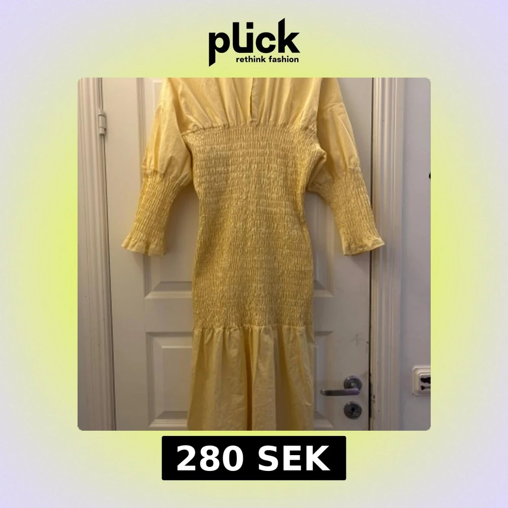 Supersöt ljusgul långklänning från Gina Tricot med smockad midja och ärmar, samt en volang nedtill. Klänningen har rund halsringning och knäppning bak i nacken. Tillverkad i mjuk bomull, perfekt för sommarens alla tillfällen.
