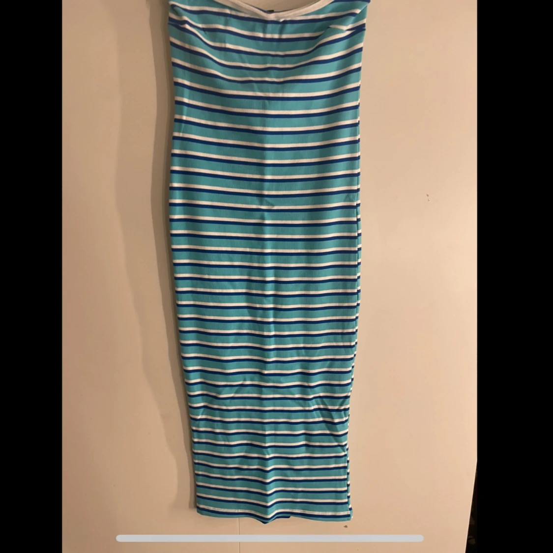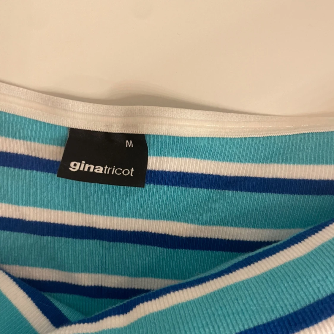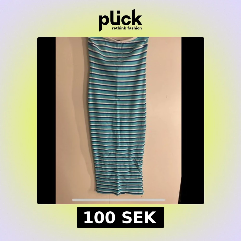 Säljer en blå- och vitrandig tubklänning från Gina Tricot. Klänningen är axelbandslös och har en tight passform med raka linjer. Perfekt för sommardagar och enkel att styla med sneakers eller sandaler.