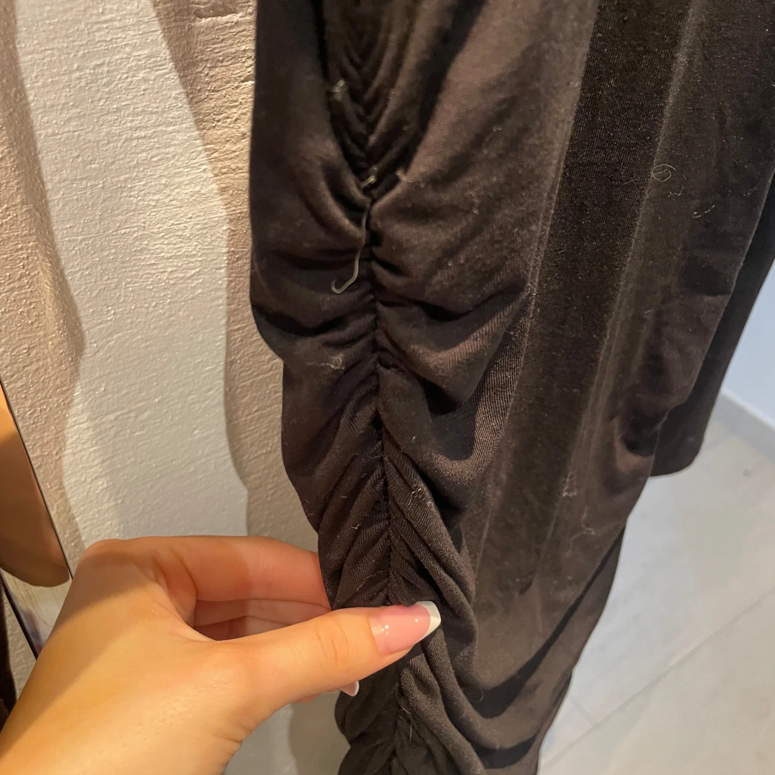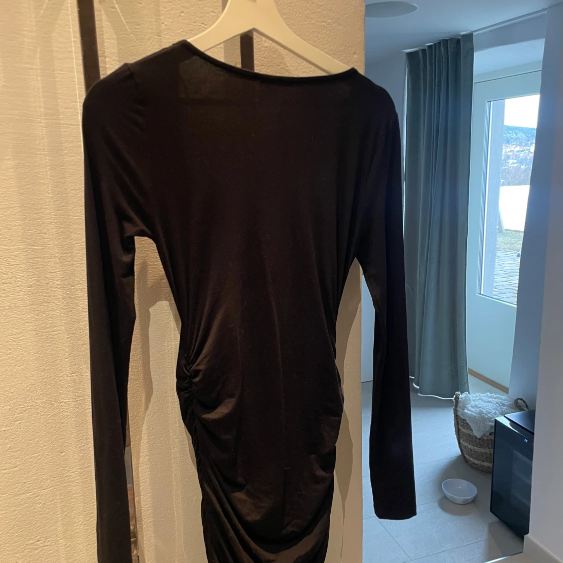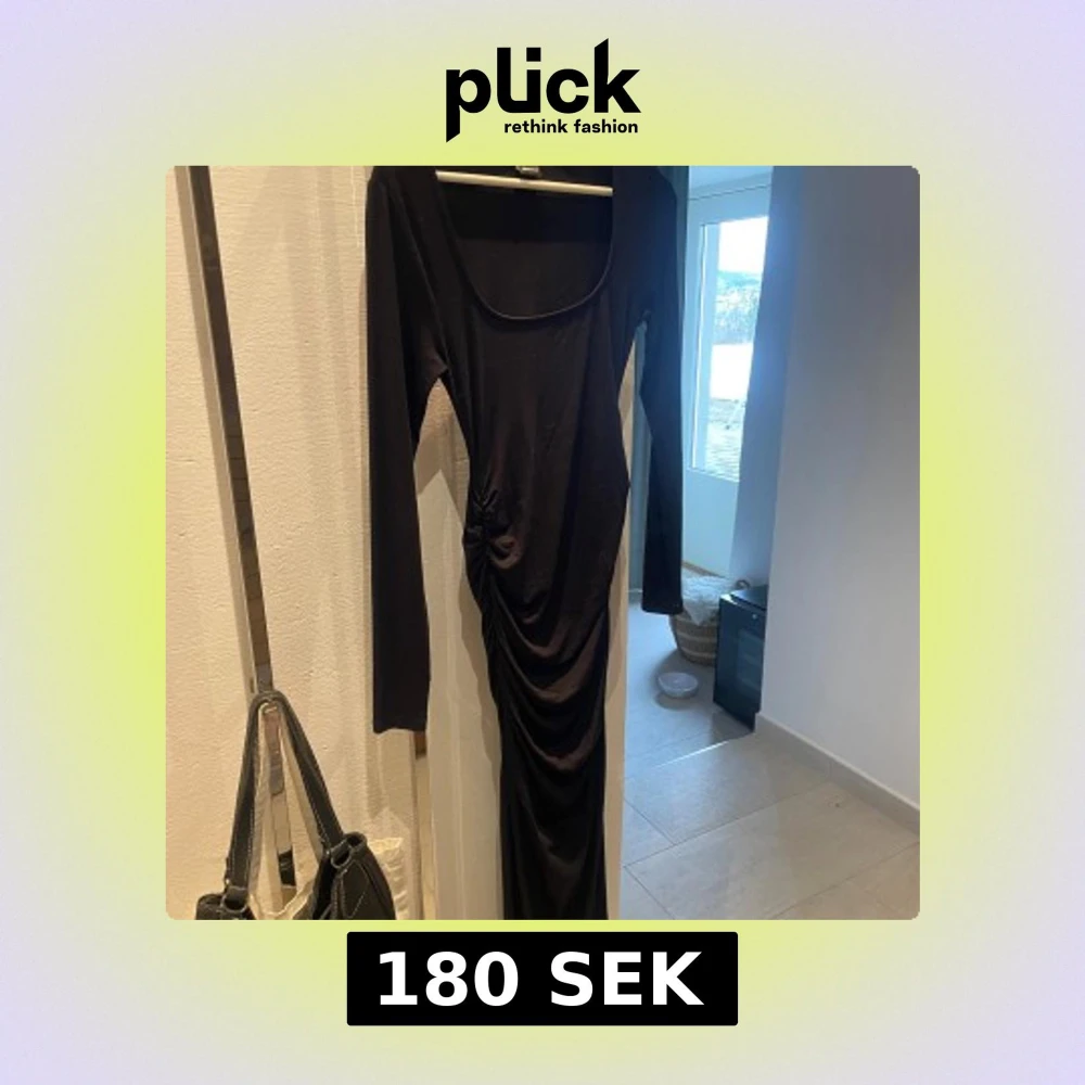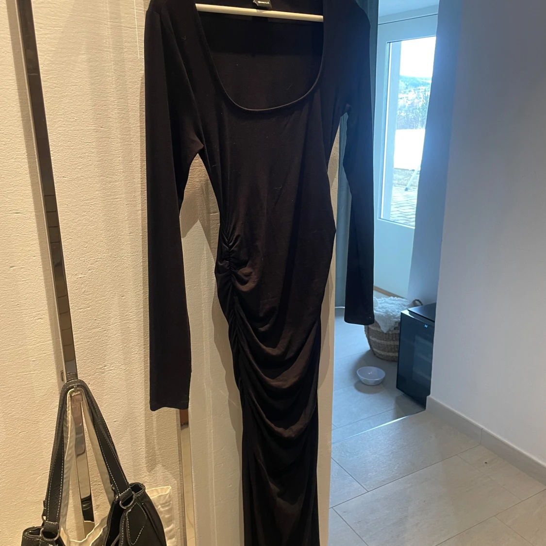 Svart långklänning från Gina Tricot med långärmad design och rynkdetaljer på sidan. Klänningen har en figurnära passform med urringning och är tillverkad i ett mjukt material. Den slutar lite nedanför vaderna på mig som är 172 cm.