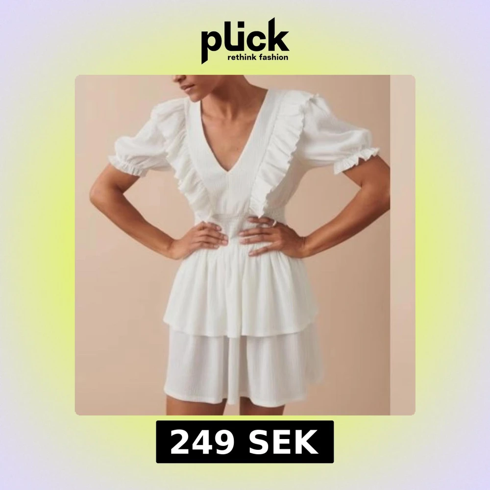 Säljer Charmig vit klänning med v-ringning och volangdetaljer från Gina tricot. Den har korta ärmar och en smickrande passform med elastisk midja. Perfekt för sommarens alla tillfällen. Den är endast använd 1 gång och testad. Skriv om ni har frågor💗
