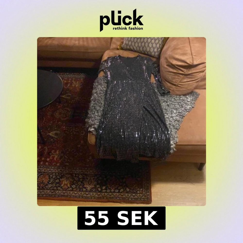 Supersnygg svart glittrig kortklänning från Gina Tricot med korta ärmar. Klänningen har ett glittrigt mönster med paljetter som ger en festlig look. Perfekt för dig som vill sticka ut och glänsa på nästa event!
