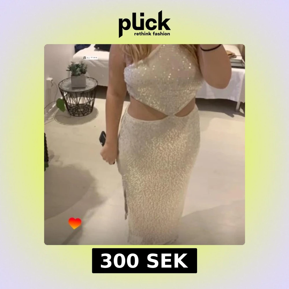 Säljer en glittrig långklänning i champagnefärg med smala axelband och snygg cut-out vid midjan. Klänningen har en slits på sidan och är täckt av paljetter som ger ett lyxigt intryck. Perfekt för bal eller fest! 💫