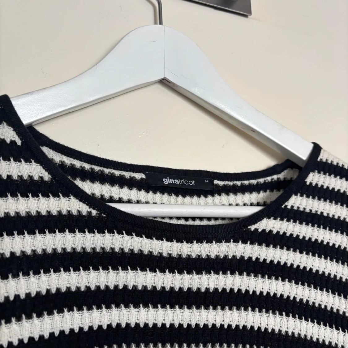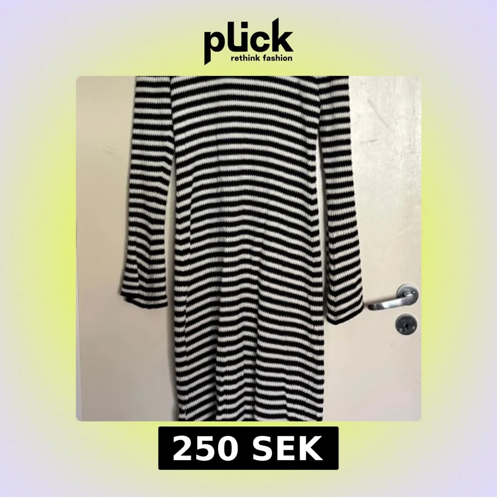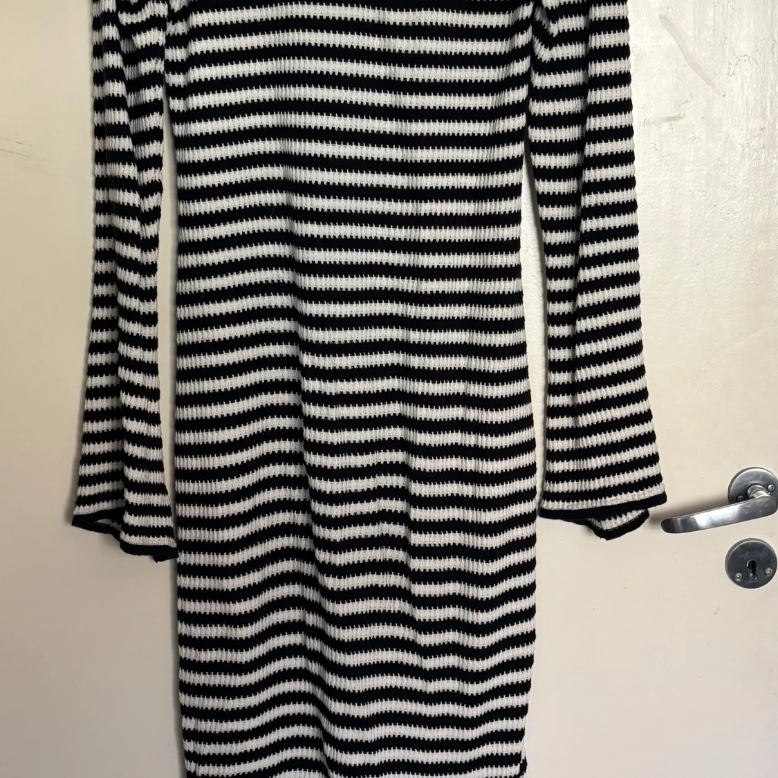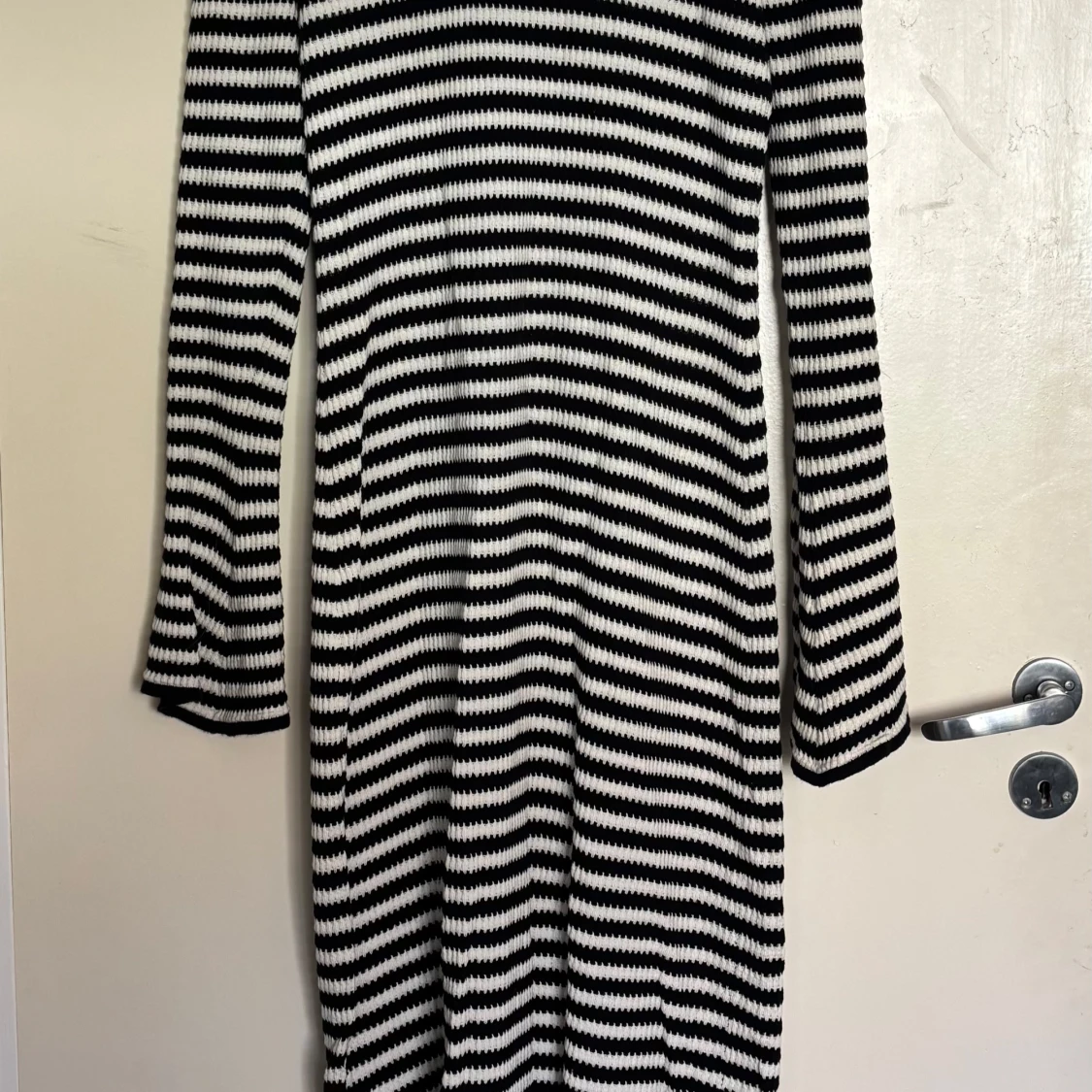 Lång stickad klänning från Gina Tricot Snygg och bekväm långärmad klänning i svartvitt randigt mönster. Stickad kvalitet som sitter fint på kroppen. Perfekt för både vardag och kväll – matcha med sneakers eller boots! Använd en gång, djur och rökfritt