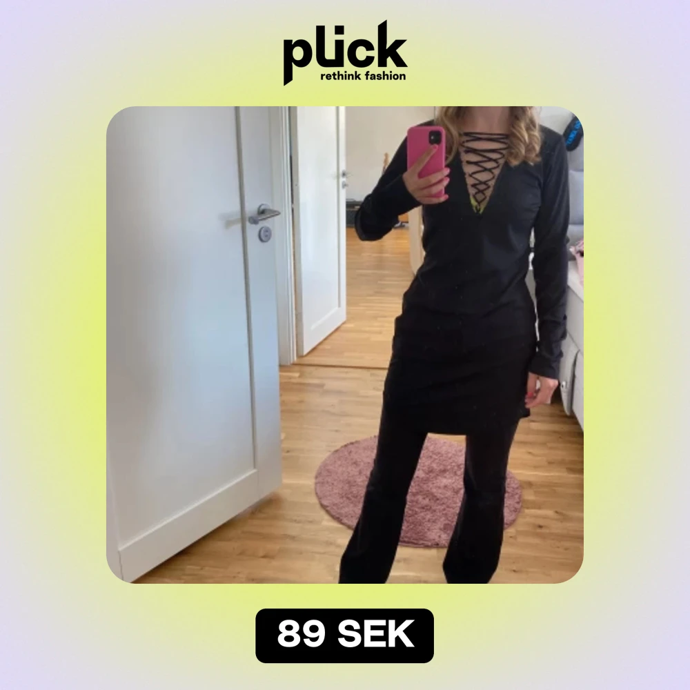 Säljer en snygg svart klänning med långärmad design och en cool snörning framtill. Perfekt för fest eller en utekväll. Klänningen har en tight passform som framhäver figuren.
