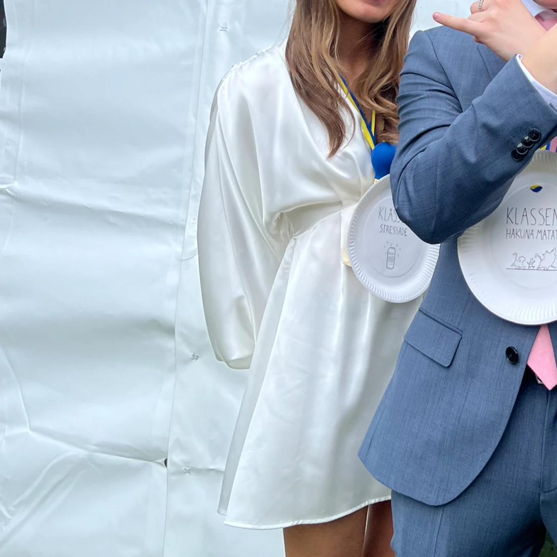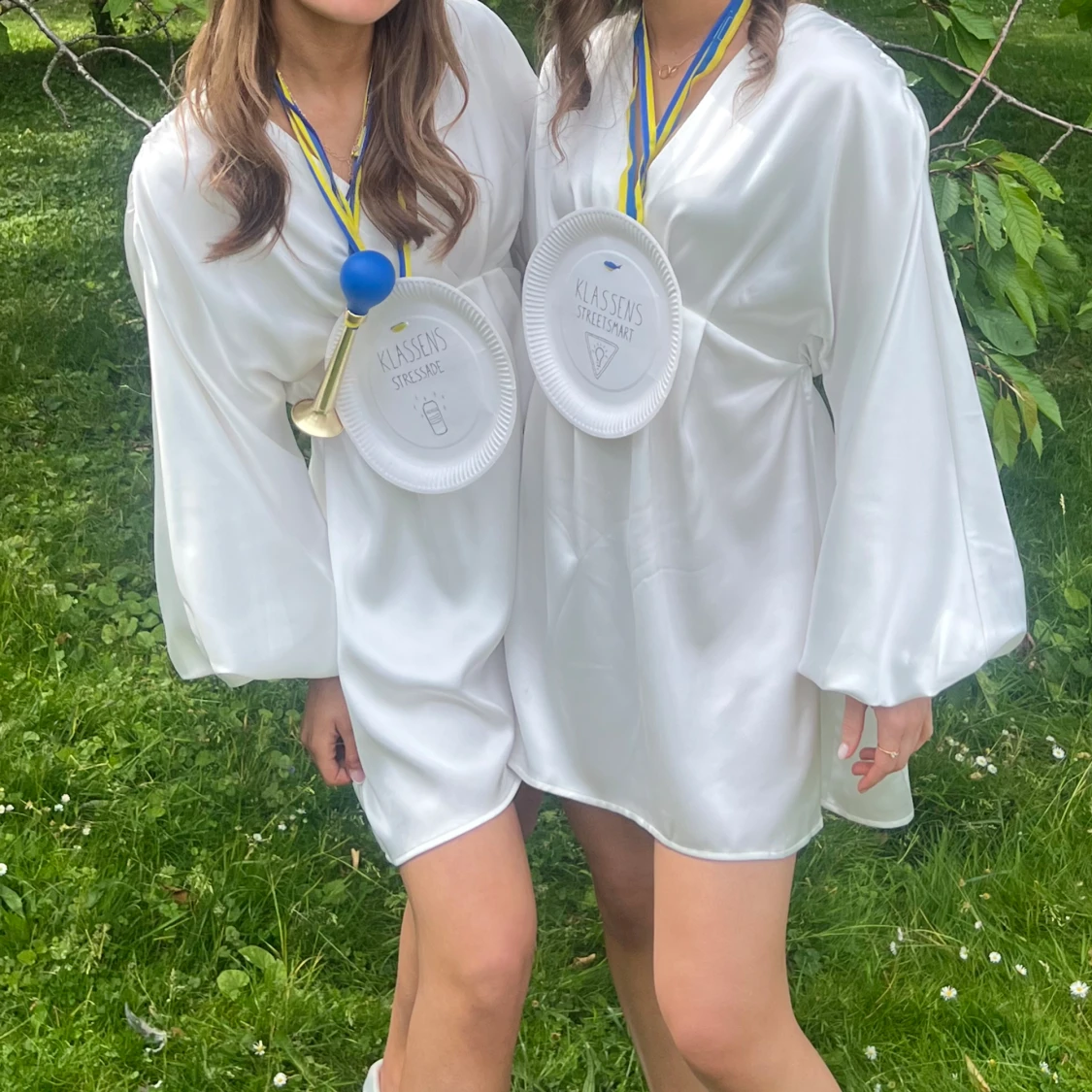 Säljer min fina satin, vita student klänning🥰 V ringad därfram, även bekväm i längden!