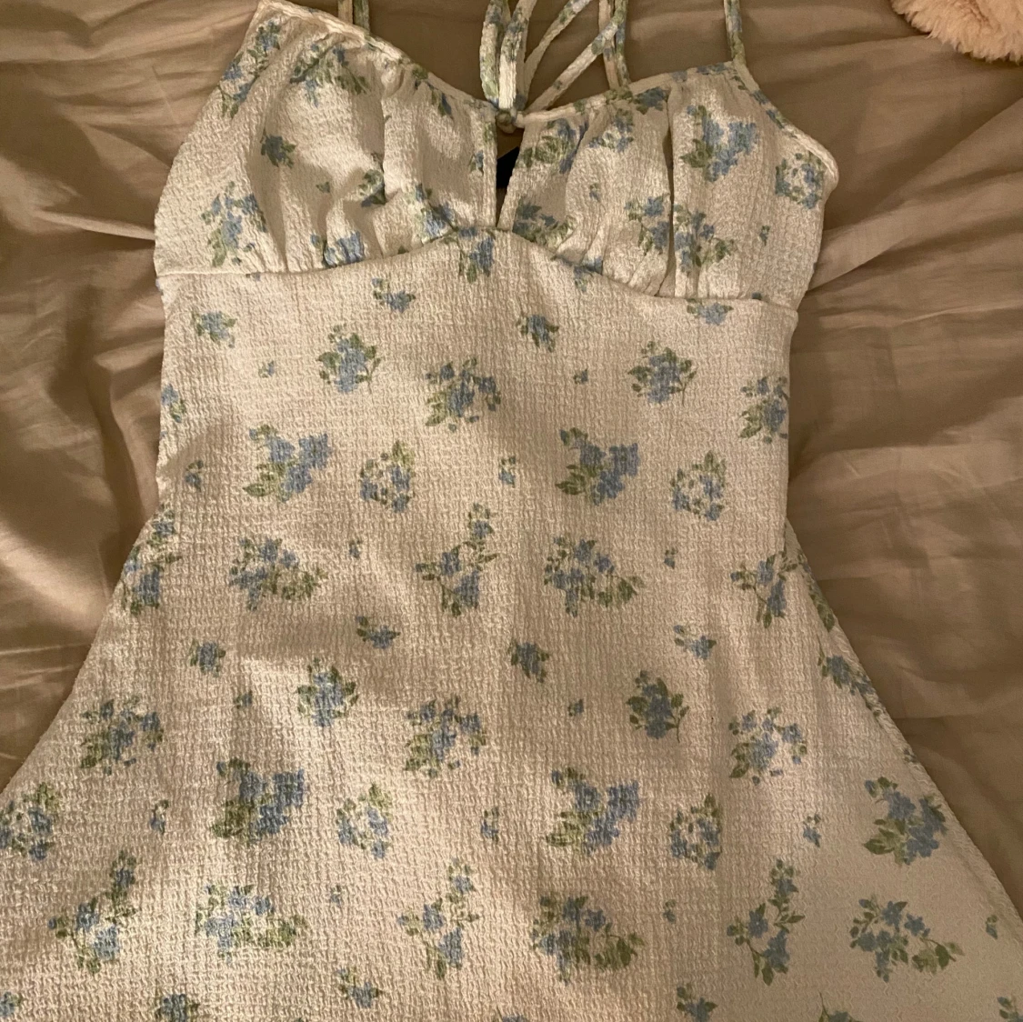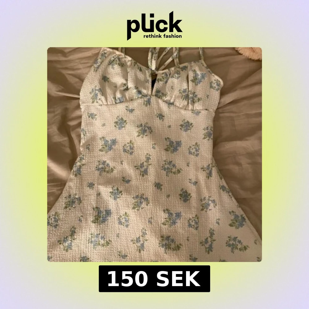 Supersöt kortklänning från Gina Tricot med ljusblå och gröna blommor på vit bakgrund. Pris kan alltid diskuteras vid snabb affär!💕