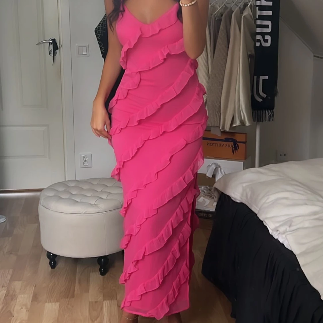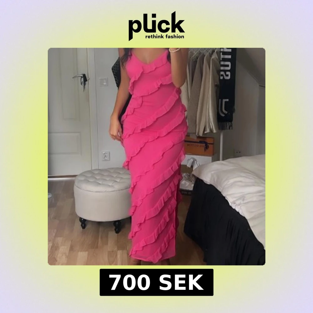 Säljer en rosa långklänning med smala axelband och v-ringad front från Ginatricot, använd en gång.