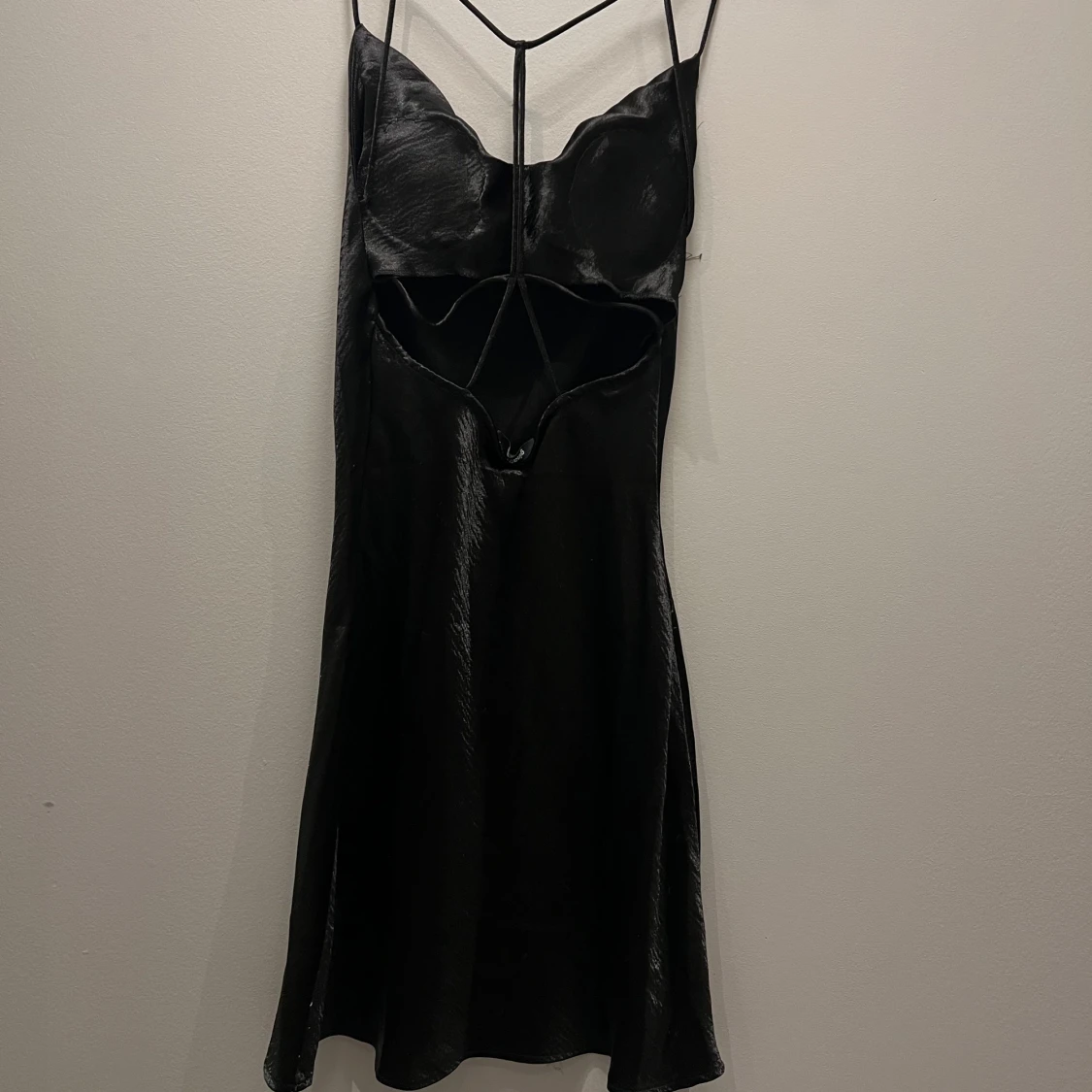 Snygg svart klänning med smala axelband och en öppen rygg. Perfekt för fest💗