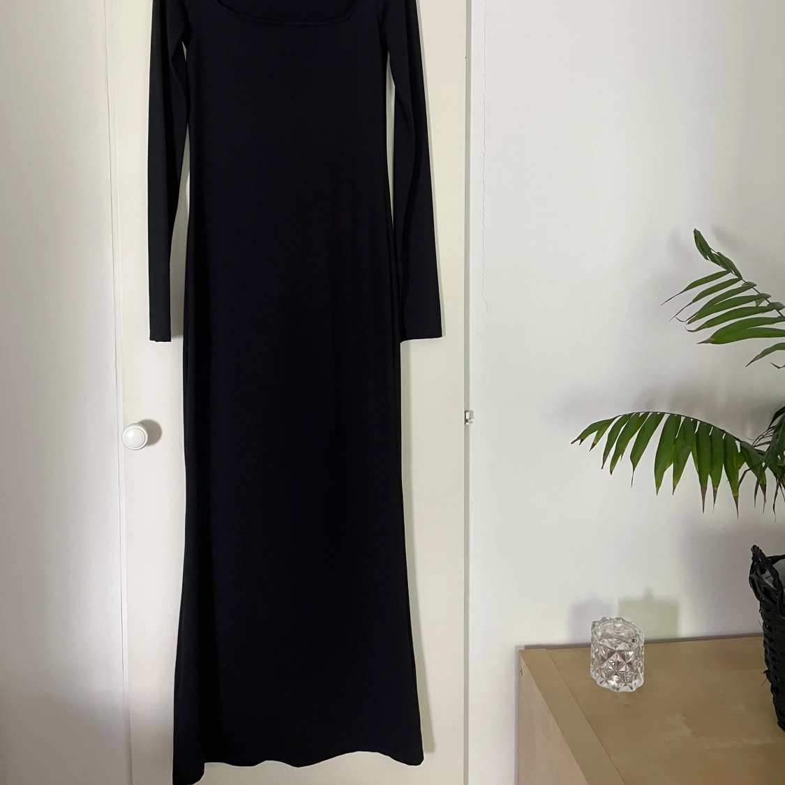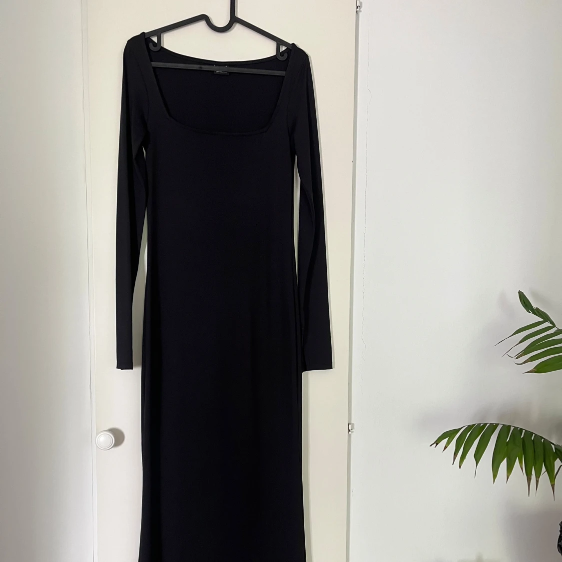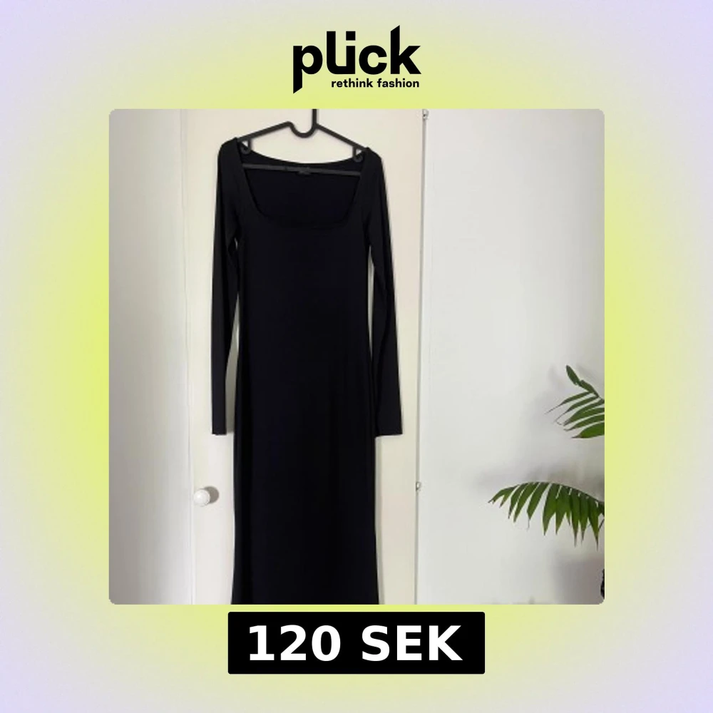 En stilren svart långklänning med lång ärm och fyrkantig urringning. Klänningen formar sig väldigt fint på kroppen. Säljer då den inte kommer till användning, den är använd max 2 gånger. Klänningen har ett glansigt material. Återkom gärna vid fler bilder på hur klänningen sitter på.