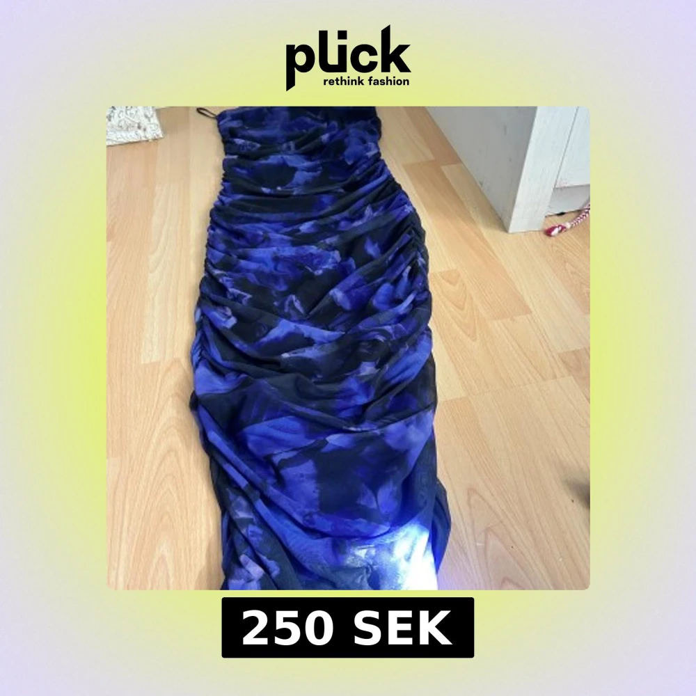 Säljer en långklänning med coolt blått och svart mönster. Klänningen har en snygg rynkad design som ger en unik look och är figurnära. Perfekt för dig som vill sticka ut med en dramatisk och modern stil.