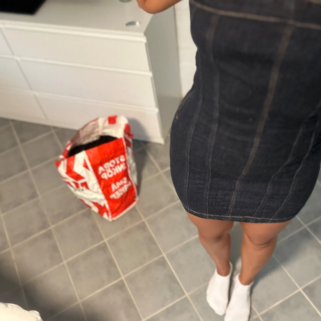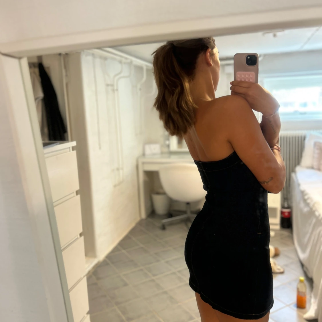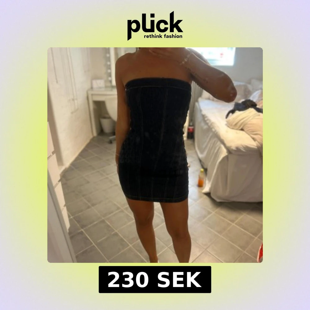 Säljer en mörkblå, tight tubklänning i jeansmaterial med markerade sömmar. Klänningen är kort och axelbandslös, perfekt för dig som gillar en enkel men snygg look. Passformen är slim och materialet är stadigt denim.