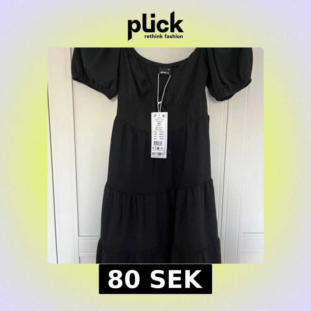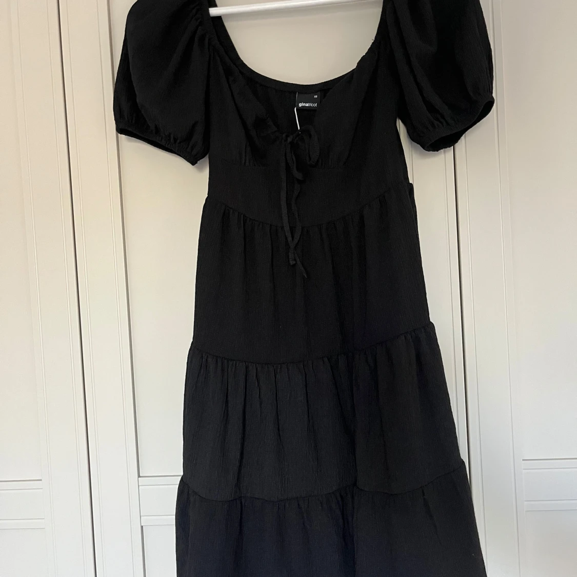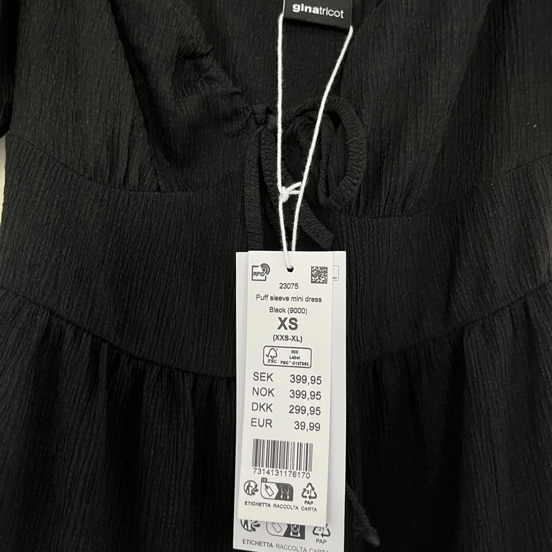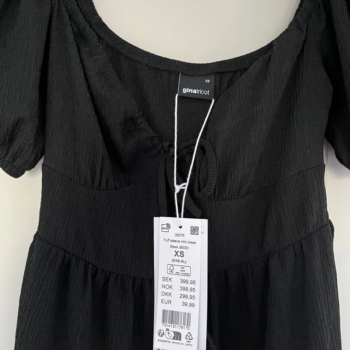 Säljer en svart kort klänning från Gina Tricot i storlek XS. Klänningen har puffärmar, knytning framtill och en volangad kjol. Materialet är lätt och har en diskret struktur som ger en cool vibe. Perfekt för dig som gillar trendiga och bekväma outfits.