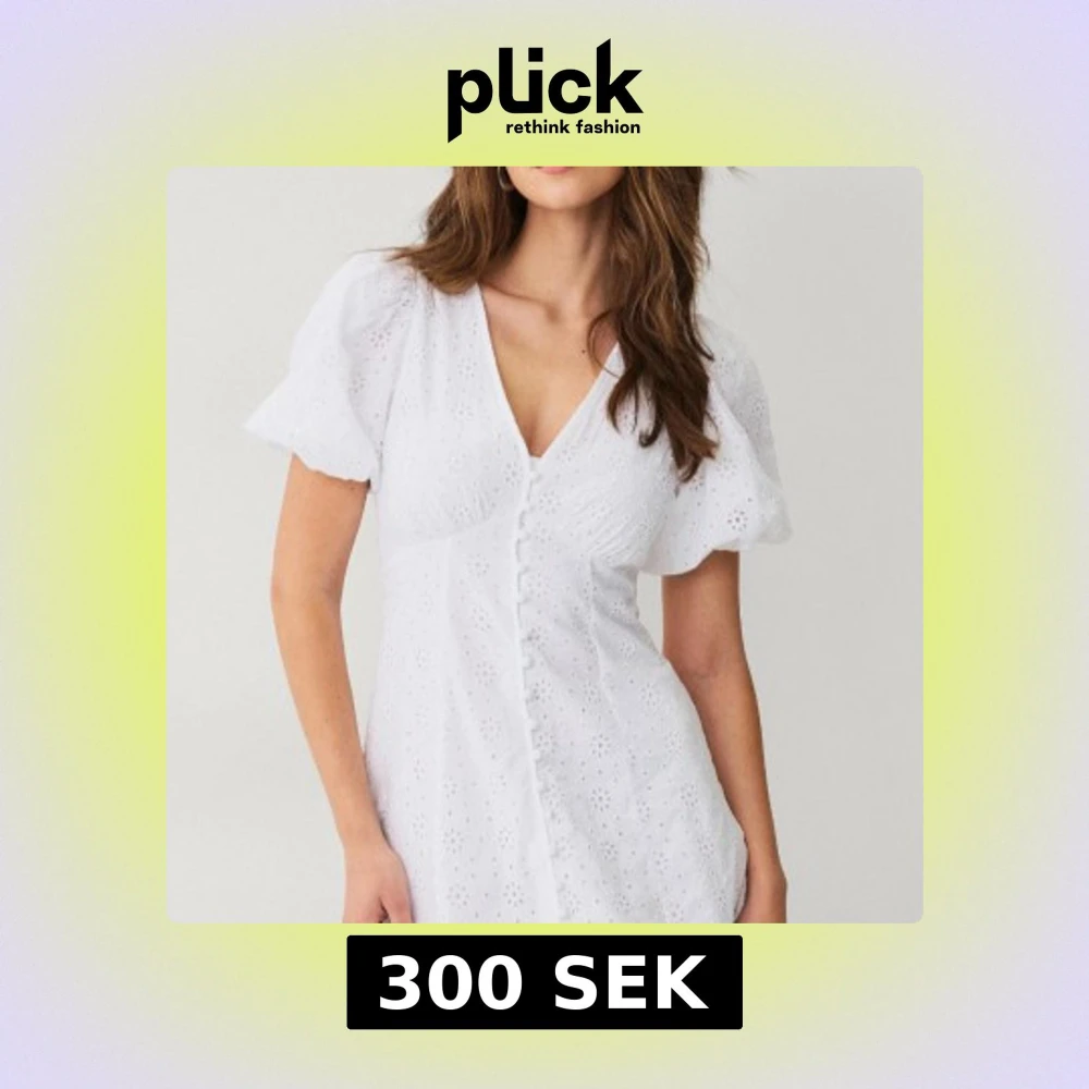 Supersöt vit klänning från Gina Tricot i storlek XS. Klänningen har puffiga korta ärmar, v-ringning och knappar framtill. Den är sydd i bomull med broderade blommor och har volang nedtill för extra flow. Den är endast använd en gång och är som ny! Perfekt till skolavslutningen och sommaren!💞💞