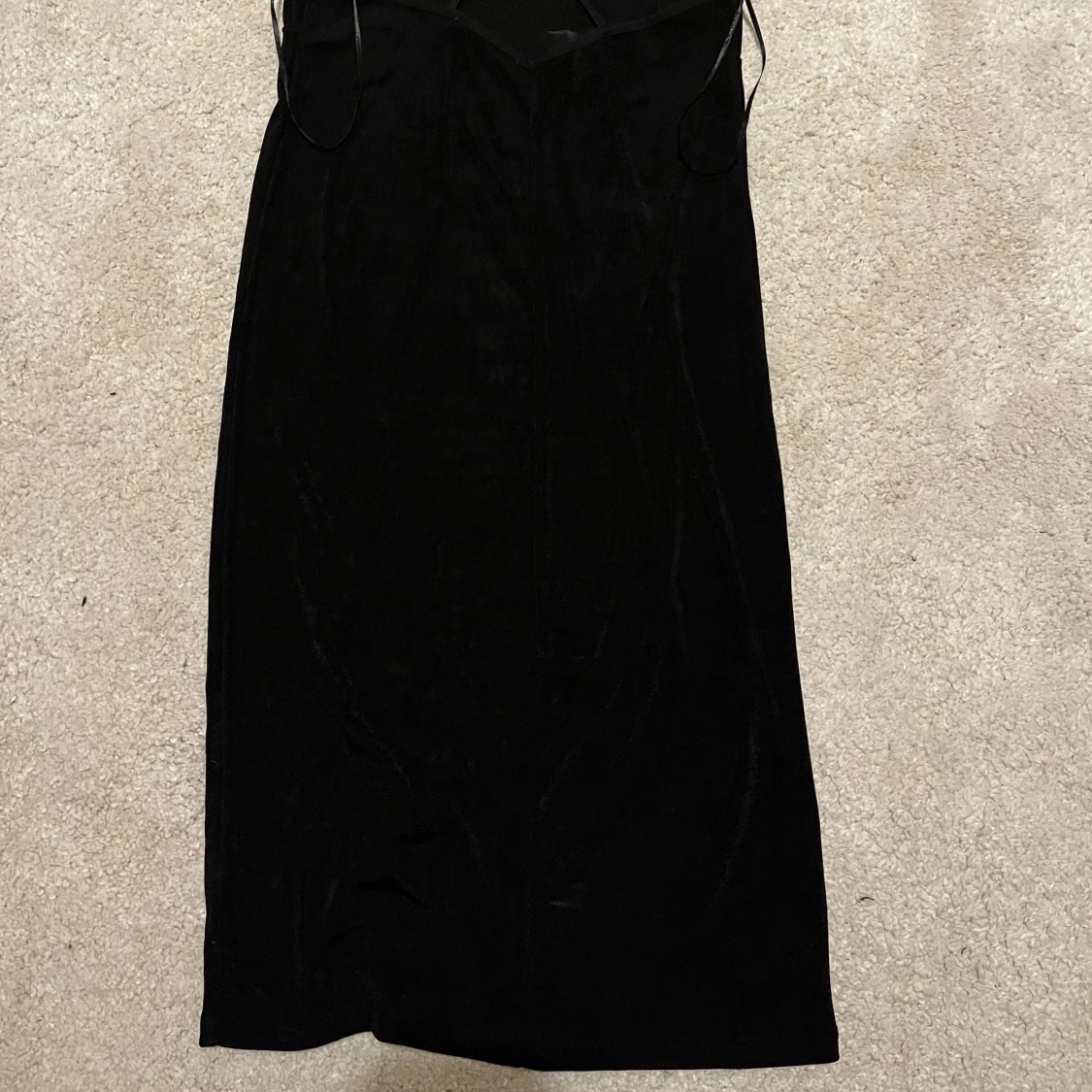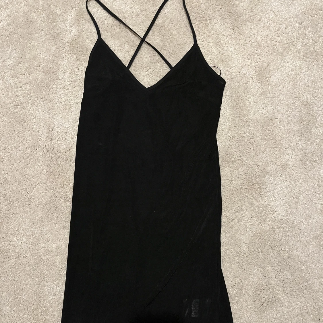Denna svarta klänning från Gina Tricot sitter tight med korsad rygg och smala band. Har en v-ringning och jätteskönt tunt och lent material 😍 är i strl xs och superduper stretchig 😊