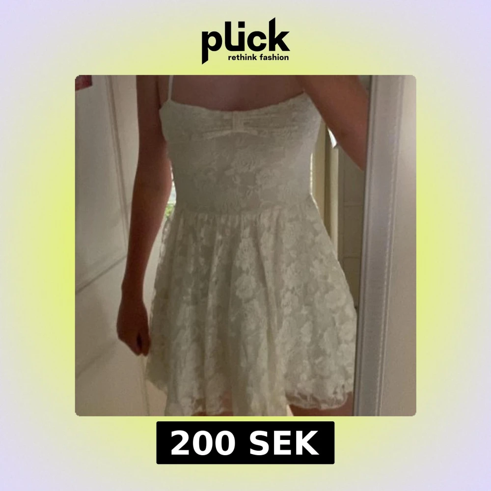 Supersöt vit kort klänning från Gina Tricot i storlek XS. Klänningen har tunna axelband, spets med blommigt mönster och en liten rosett framtill. Perfekt för sommarens alla tillfällen när du vill känna dig extra fin.
