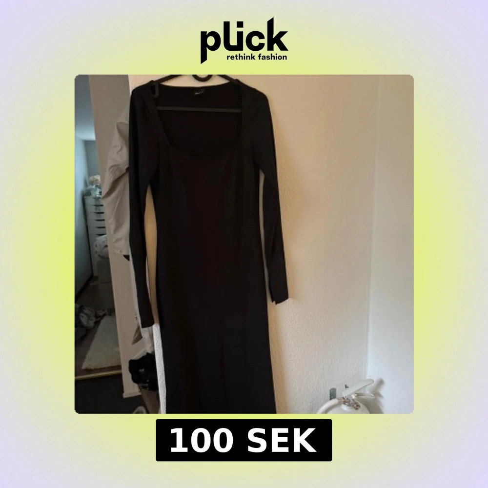 Säljer en stilren svart långklänning från Gina Tricot med fyrkantig ringning och långa ärmar. Klänningen har en figurnära passform och är perfekt för dig som gillar en enkel men elegant look. så skönt material🥹🙌🏼 snarare xs än s dock!