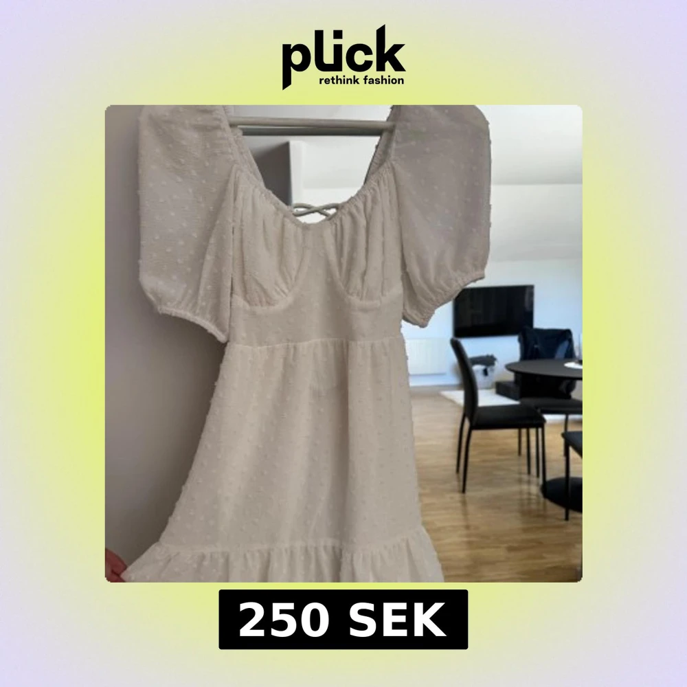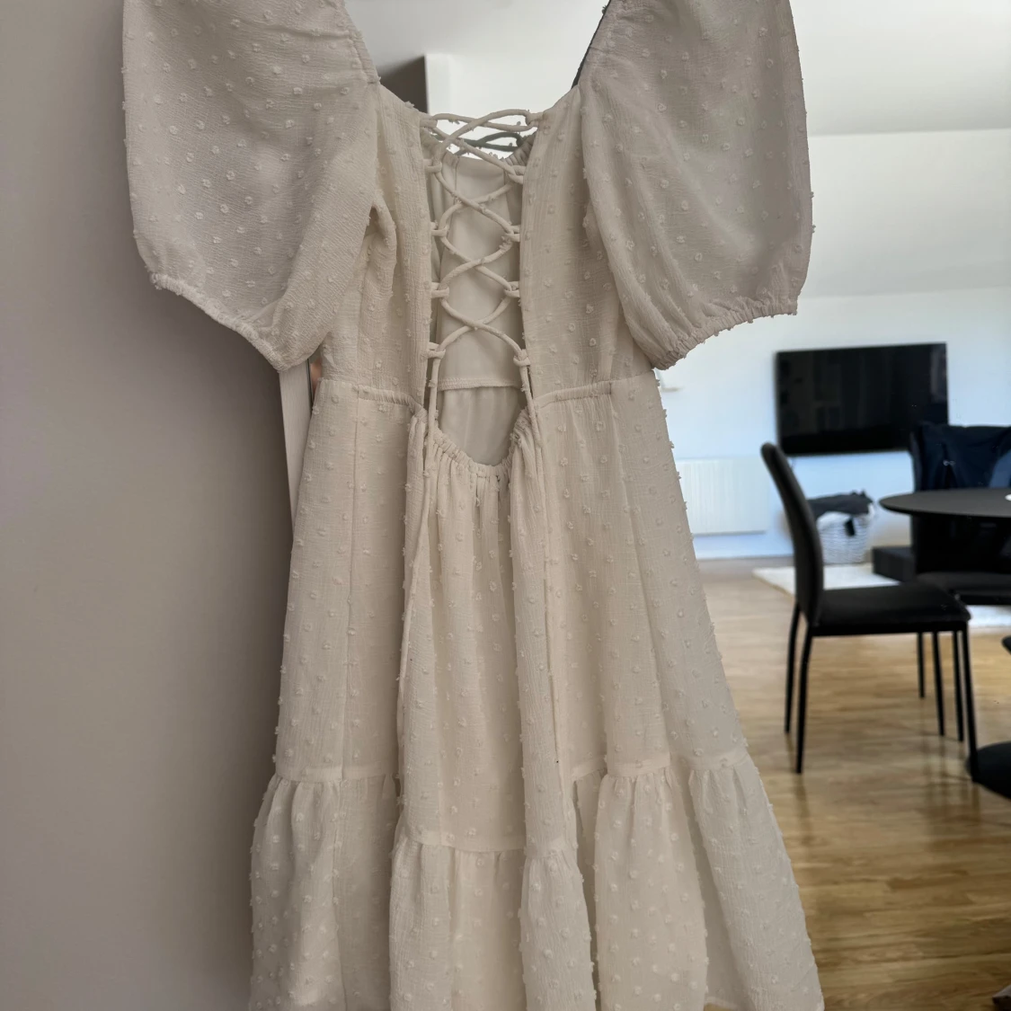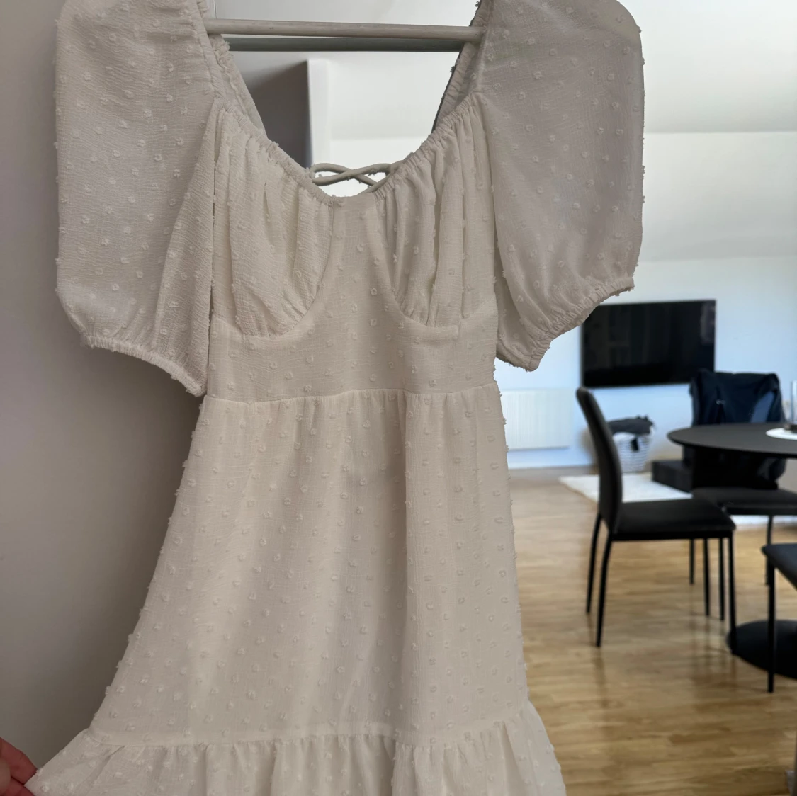 Superfin vit kortklänning med puffärmar och söt struktur i tyget. Klänningen har v-ringning framtill och snygg snörning i ryggen. Perfekt för sommarens alla tillfällen!