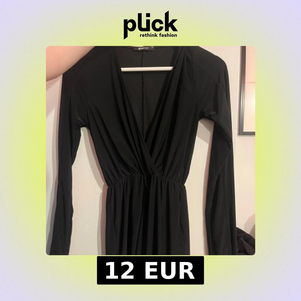 Svart långärmad klänning från Gina Tricot med omlott-skärning och markerad midja. Klänningen har djup v-ringning och är tillverkad i ett mjukt, stretchigt material som ger en snygg passform. Perfekt för dig som gillar stilrena och enkla plagg.