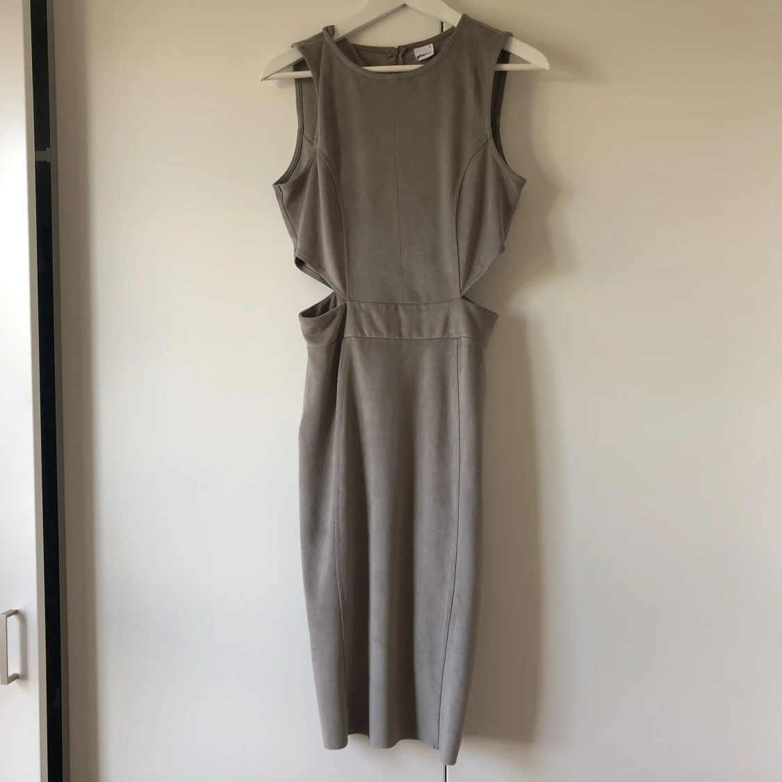 Grå vadlång klänning i mockaimitation med cut-out detaljer . Använd 1 gång , så gott som ny! Ev frakt betalas av köpare.