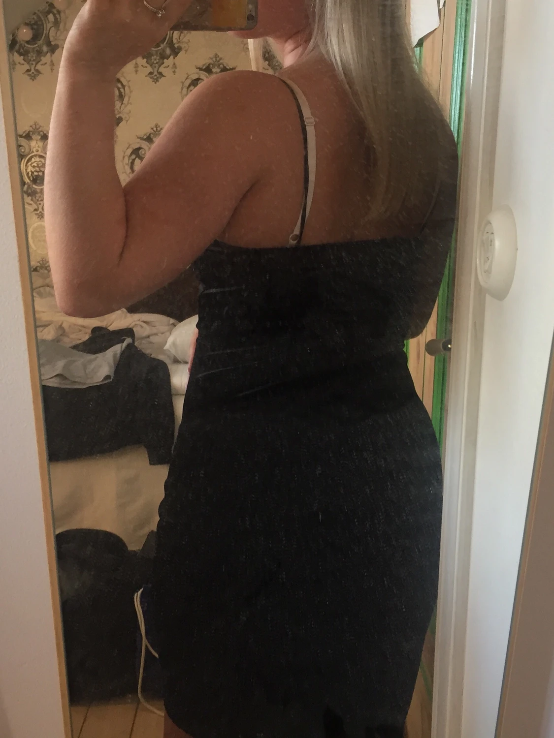 En svart urringad fin klänning i krossat sammet som visar ens kurvor riktigt fint, smala band. Köparen står för frakten.