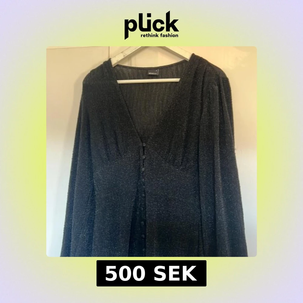Snygg svart klänning från Ginatricot med glittrigt material och knappar framtill. Den har en v-ringad design och långa ärmar, perfekt för en kväll ute. Klänningen har en elegant och stilren look. Sitter väldigt fint på kroppen, liknar Adoore klänningarna.