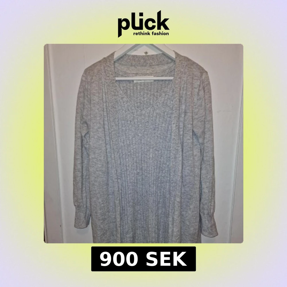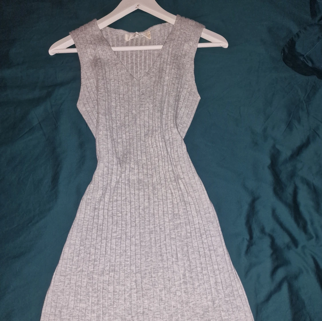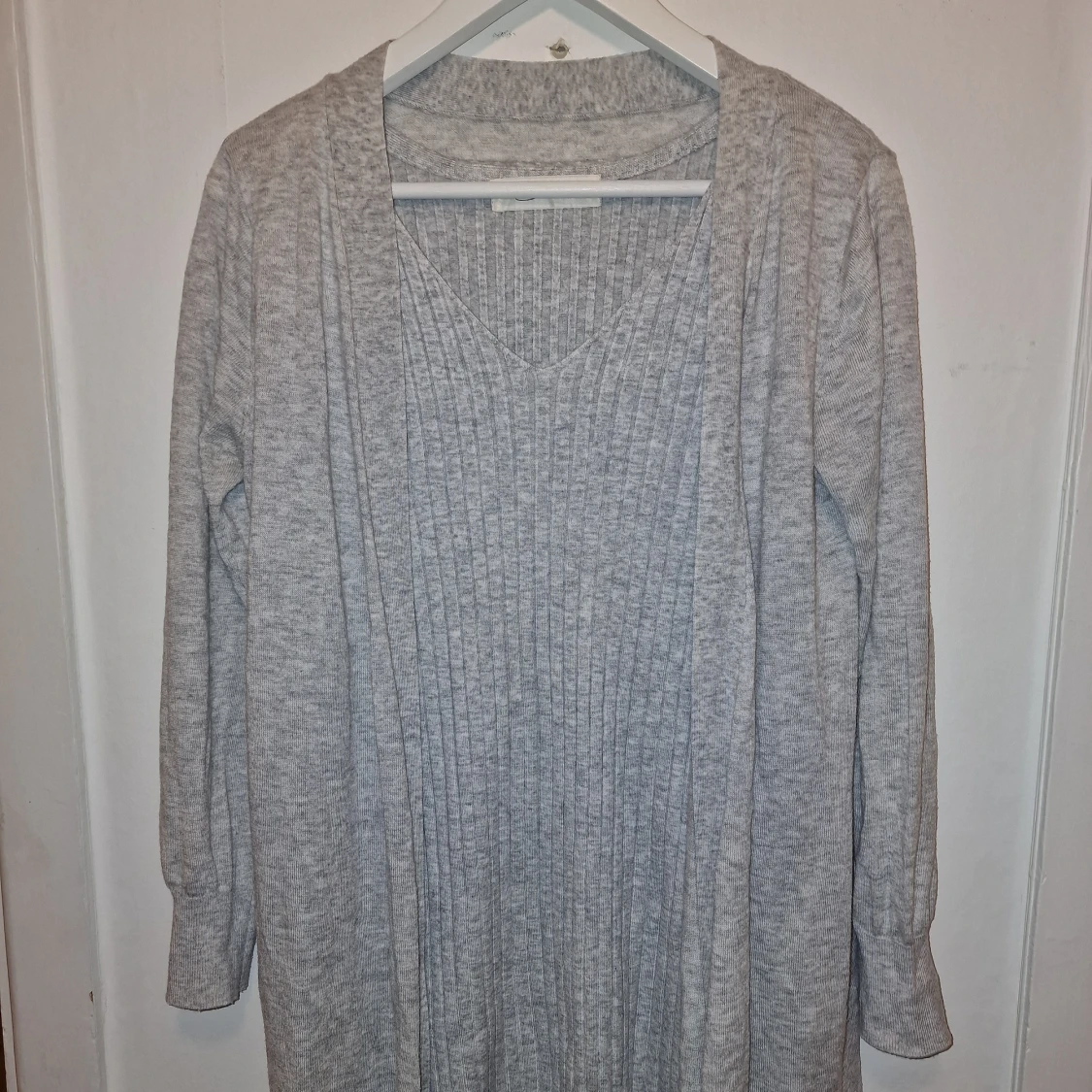 Snygg grå ribbstickad klänning med v-ringning och ärmlös design, tillsammans med matchande långärmad kofta. Storlek S/liten M. Kostade runt 1270 kr i inköp, japanskt märke.
