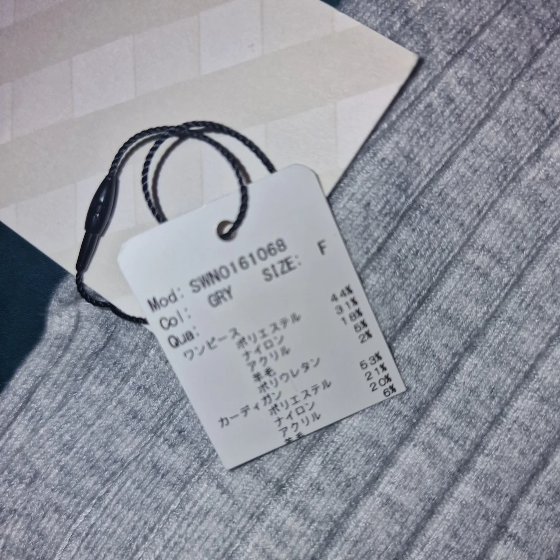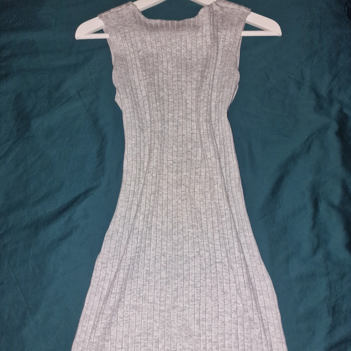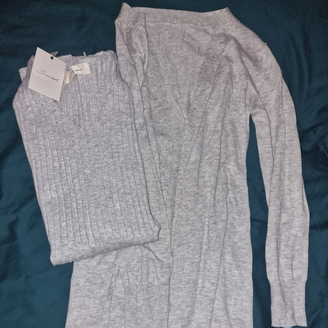 Snygg grå ribbstickad klänning med v-ringning och ärmlös design, tillsammans med matchande långärmad kofta. Storlek S/liten M. Kostade runt 1270 kr i inköp, japanskt märke.
