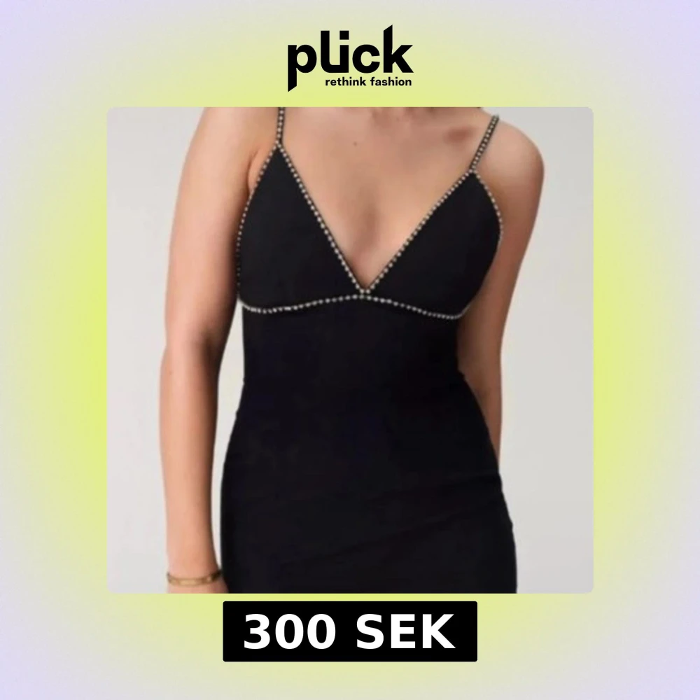 Supersnygg svart kort klänning från ADOORE med tunna axelband och djup v-ringning. Klänningen har stendetaljer längs urringningen och nederkanten, samt en figurnära passform!Perfekt till nyårsfirandet! Helt ny med lappar på, säljes pga dessvärre för liten för mig.