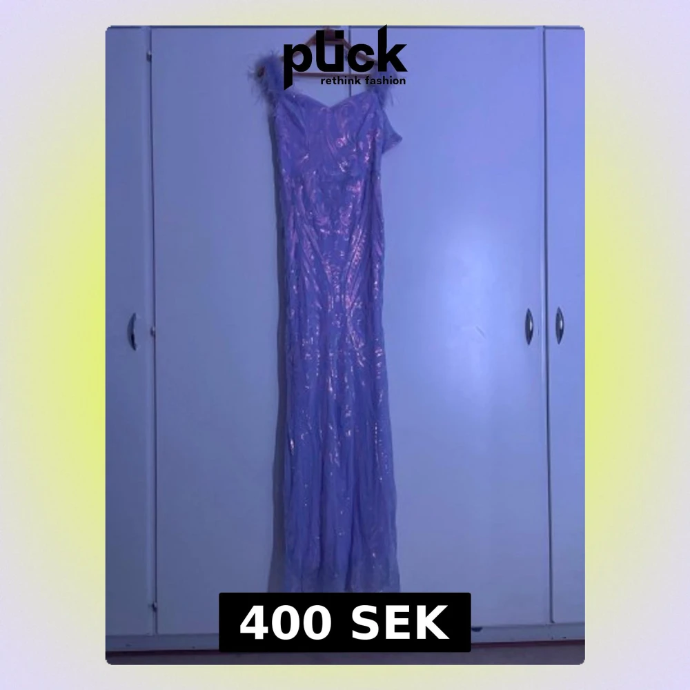 Säljer en glittrig långklänning i lila med paljetter och fjäderdetaljer vid axlarna. Klänningen har en figurnära passform och offshoulder-design som ger en elegant look. Perfekt för dig som vill sticka ut på nästa bal eller fest. Har bara provat den en gång och är helt oanvänd
