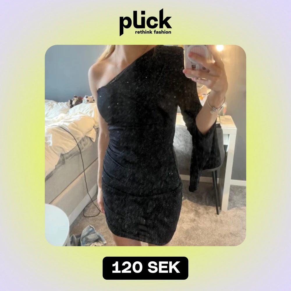 Aldrig använd! Köpte men tycker inte om den. Glittrig men glittrar inte av sig. One shoulder klänning. Bra till fest. Ganska tunt och stretchig material. Har en slits på ärmen.