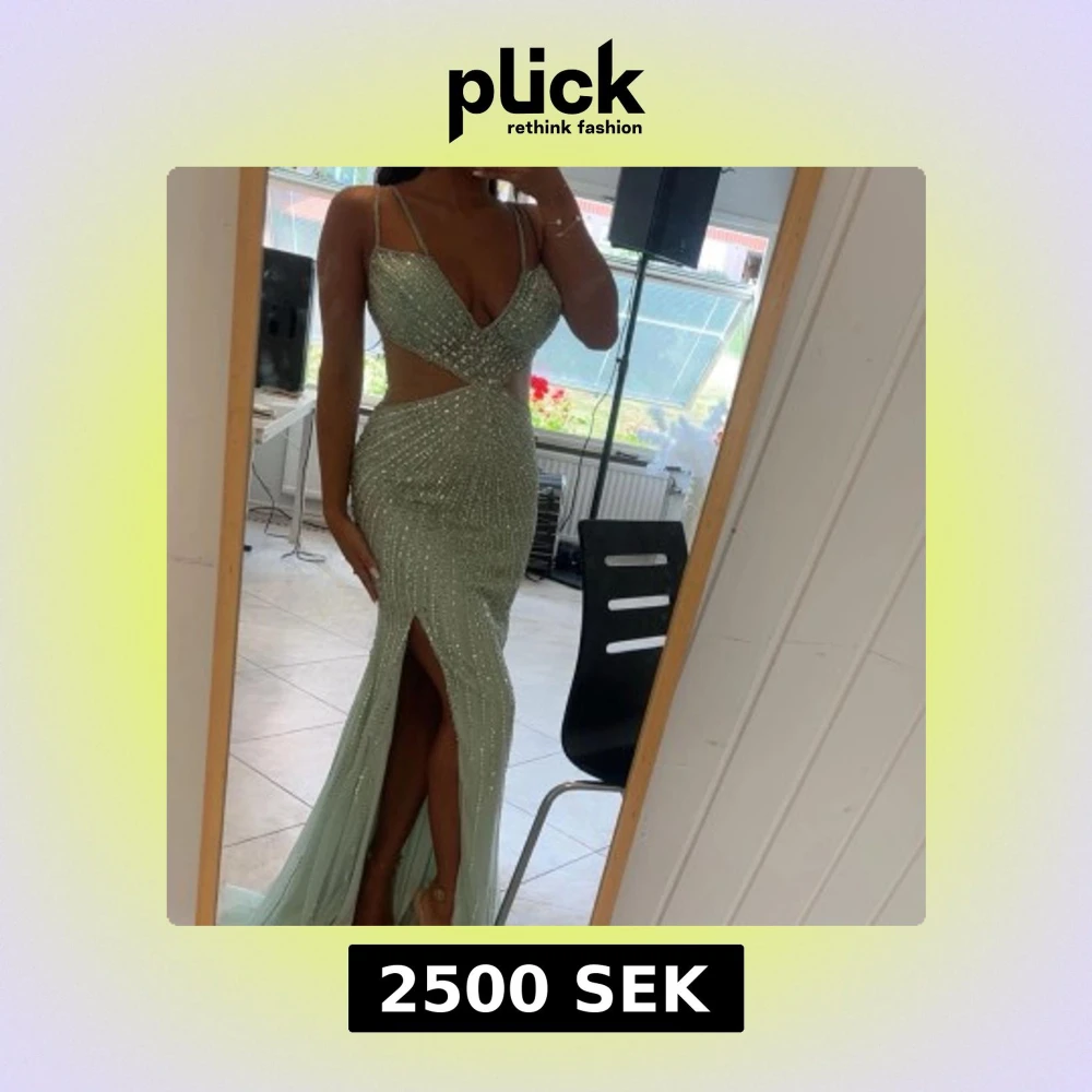 Säljer en mintgrön långklänning med glittriga detaljer och smala axelband. Klänningen har v-ringning, öppen rygg och snygga cut-outs i midjan. Den är figurnära med hög slits framtill och ett elegant fall. Perfekt för bal eller fest! Använd bara i några timmar! Pris kan diskuteras
