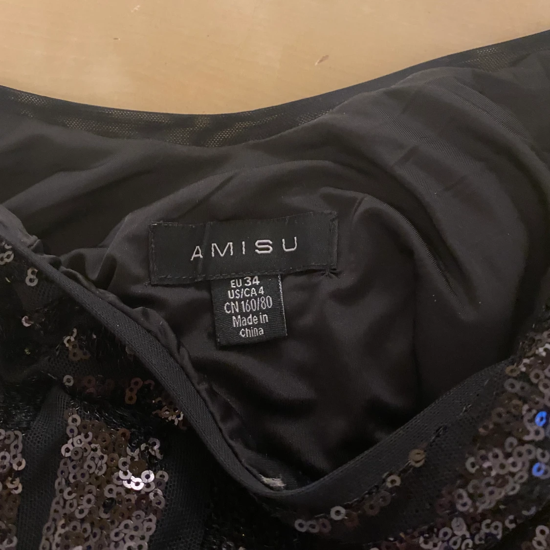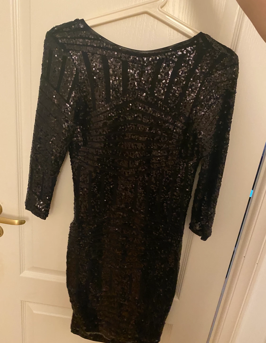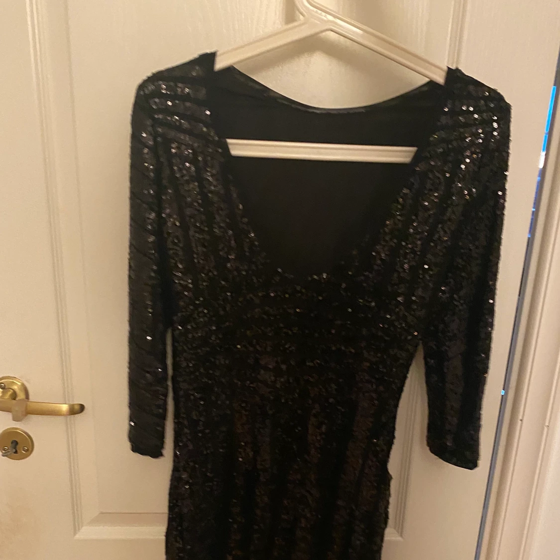 En svart glittrig klänning med låg rygg som är perfekt till fest 🎉 Endast använd 2-3 gånger och är i väldigt bra skick! Om ni vill ha fler bilder så är det bara att fråga efter det.