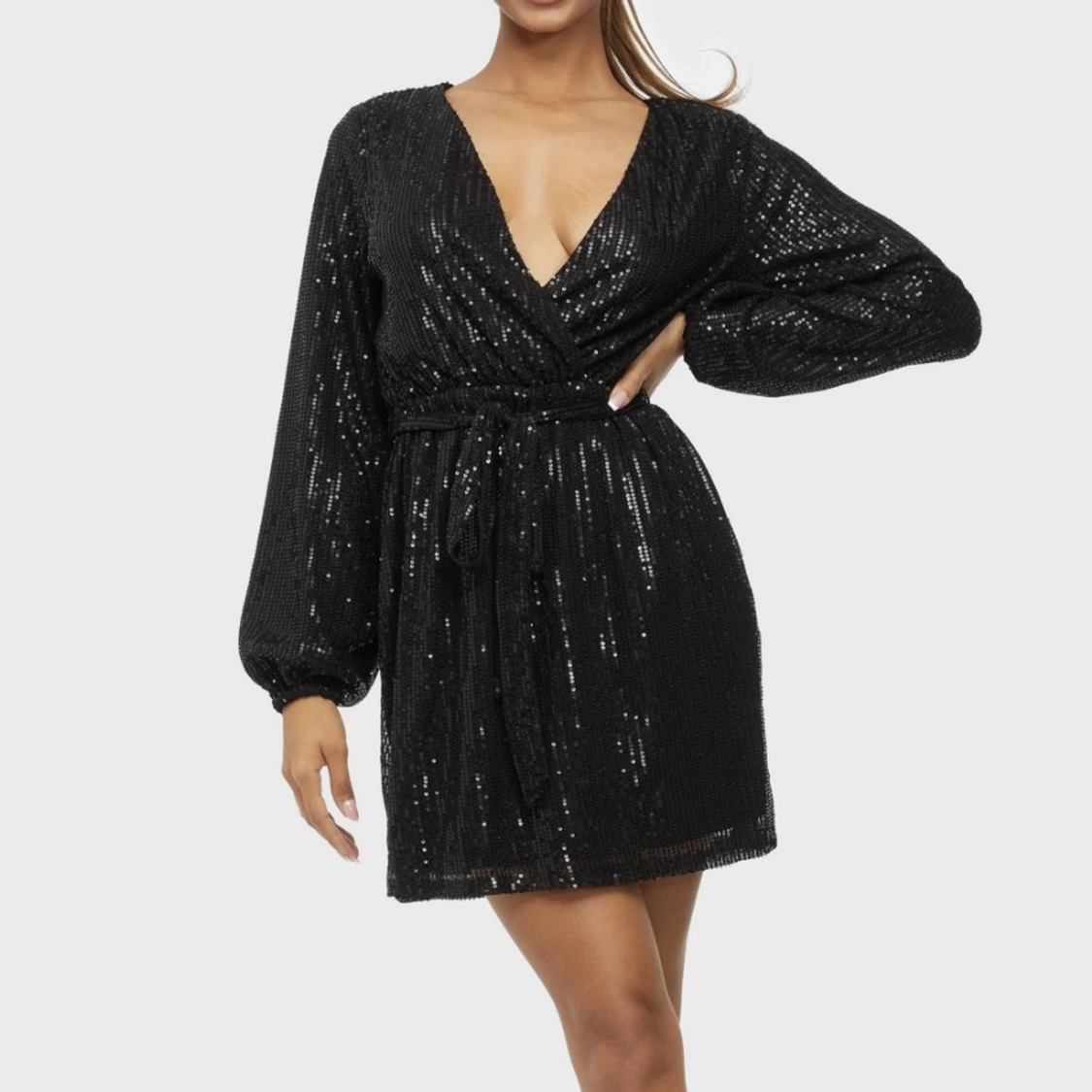 En svart glittrig klänning i stl M med ett tillhörande skärp som går att ta bort. Använd en gång och några paljetter har lossnat men inget som man tänker på. Nypris 599
