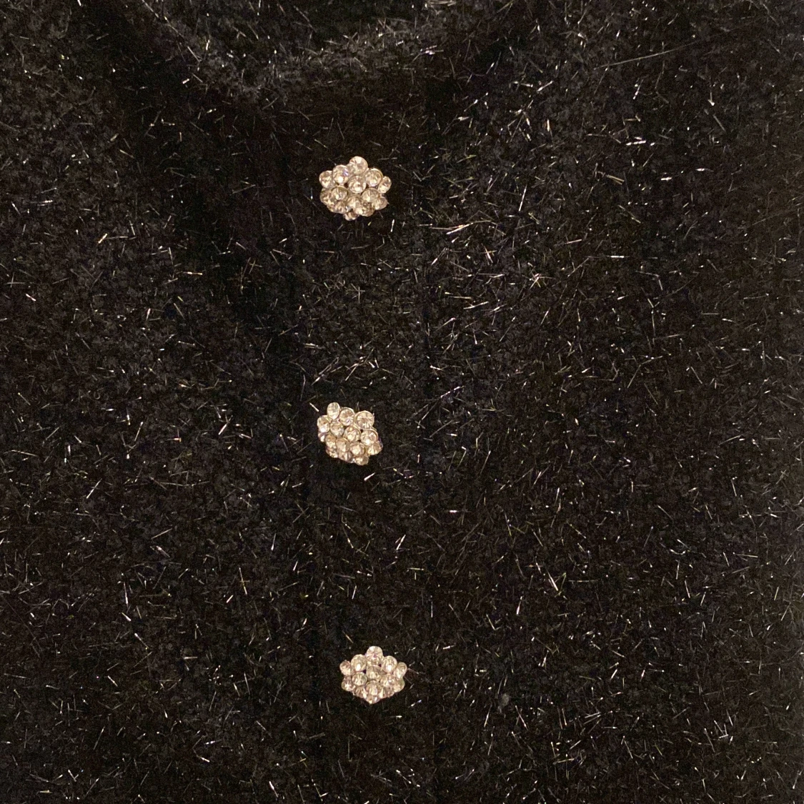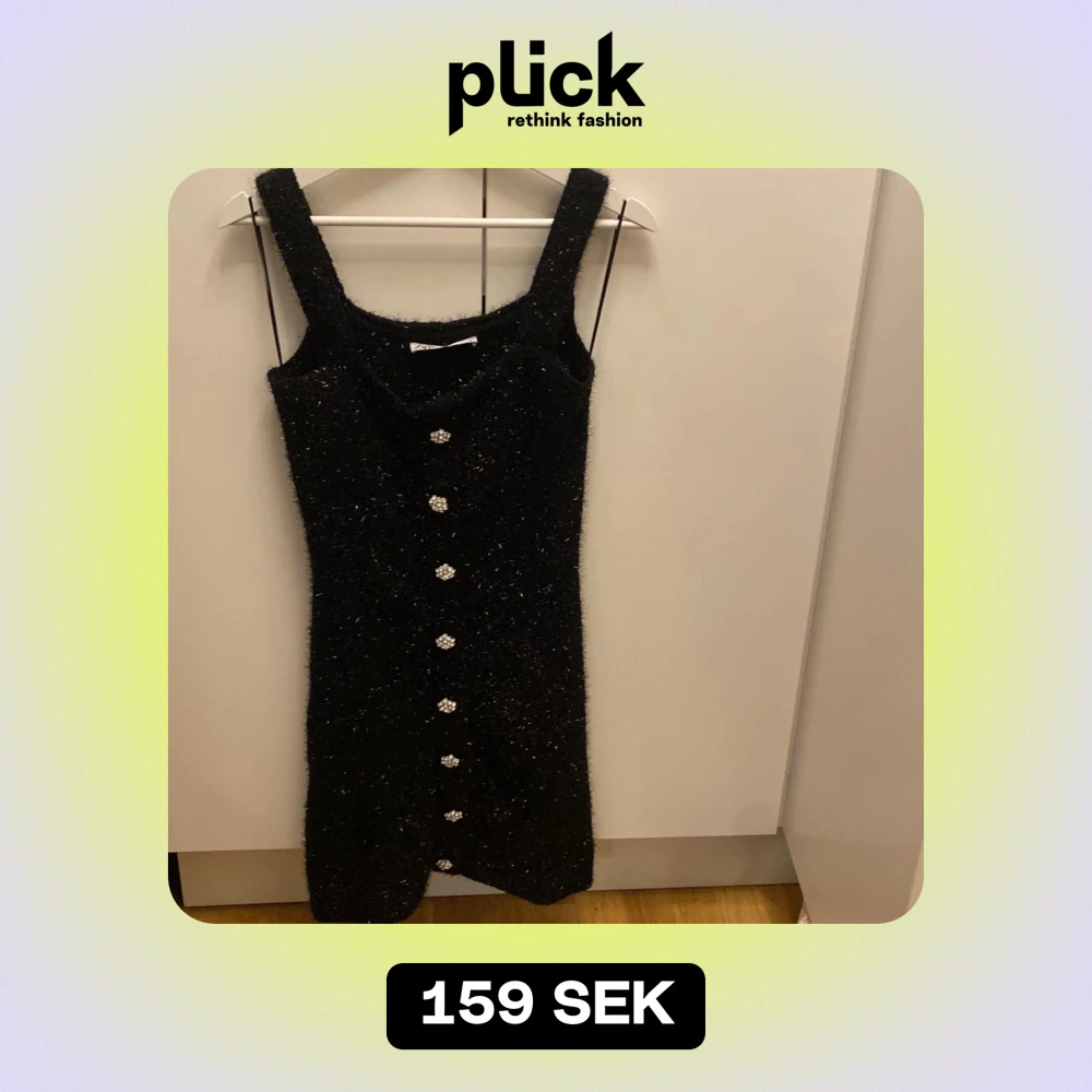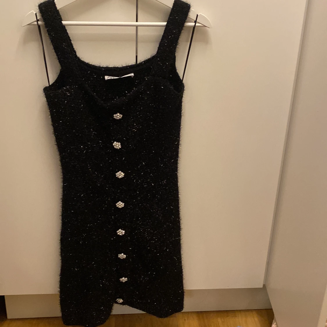 Snygg svart glittrig klänning från Zara i storlek S. Klänningen har dekorativa knappar framtill och är perfekt för festliga tillfällen. Den är ärmlös och har en tight passform som framhäver figuren. Perfekt för en utekväll eller nyårsfest! Aldrig använd!