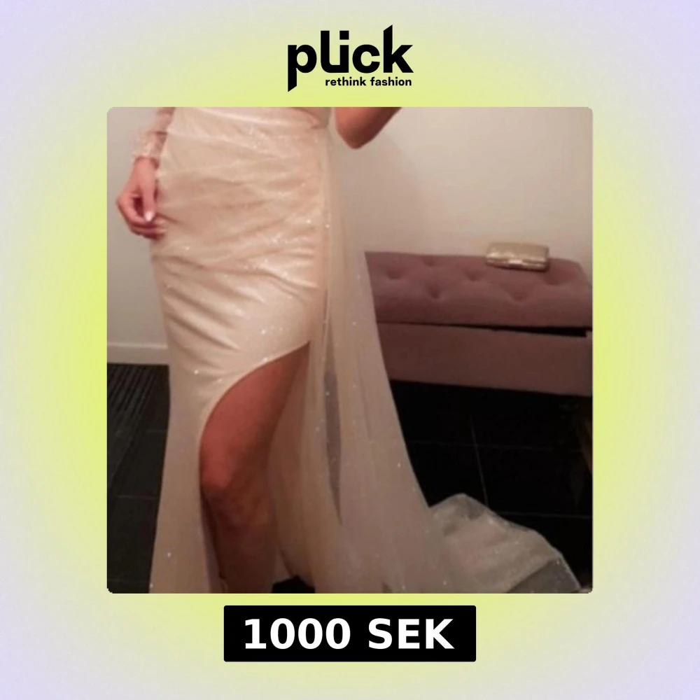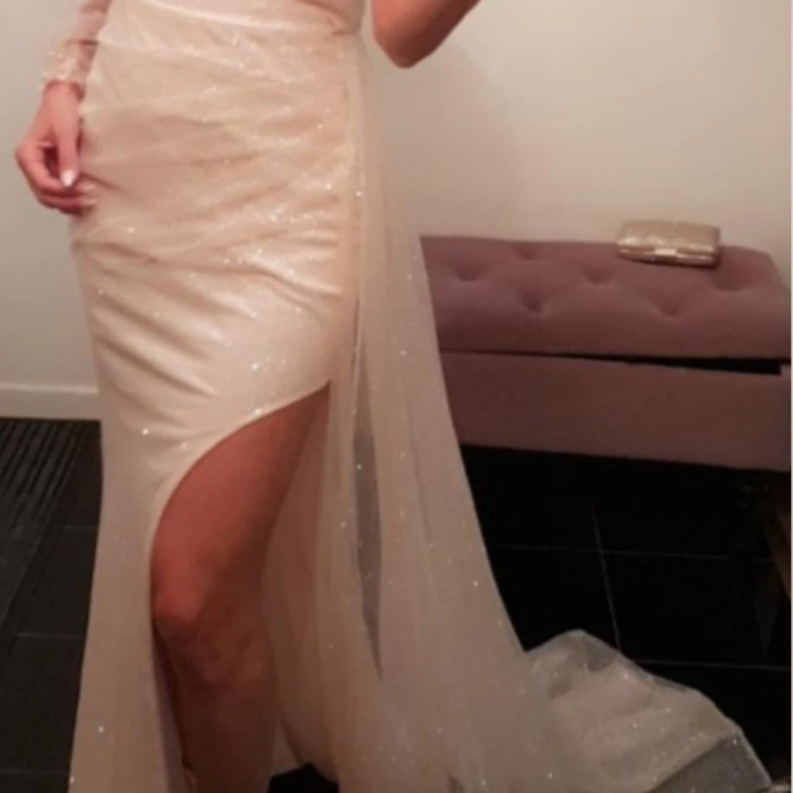 Supersnygg långklänning i champagnefärg med glittrigt tyg och hög slits. Klänningen har en elegant och figurnära passform, perfekt för att sticka ut. Tunn, svepande material som ger en lyxig känsla.