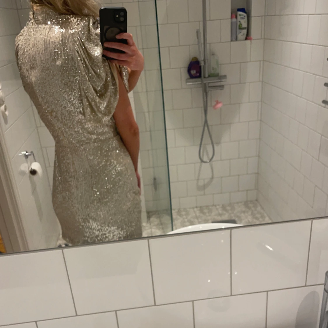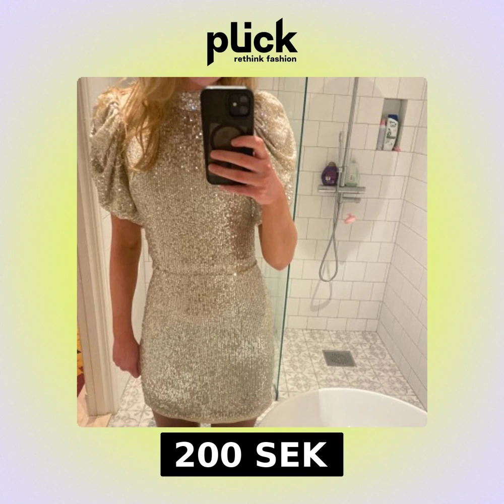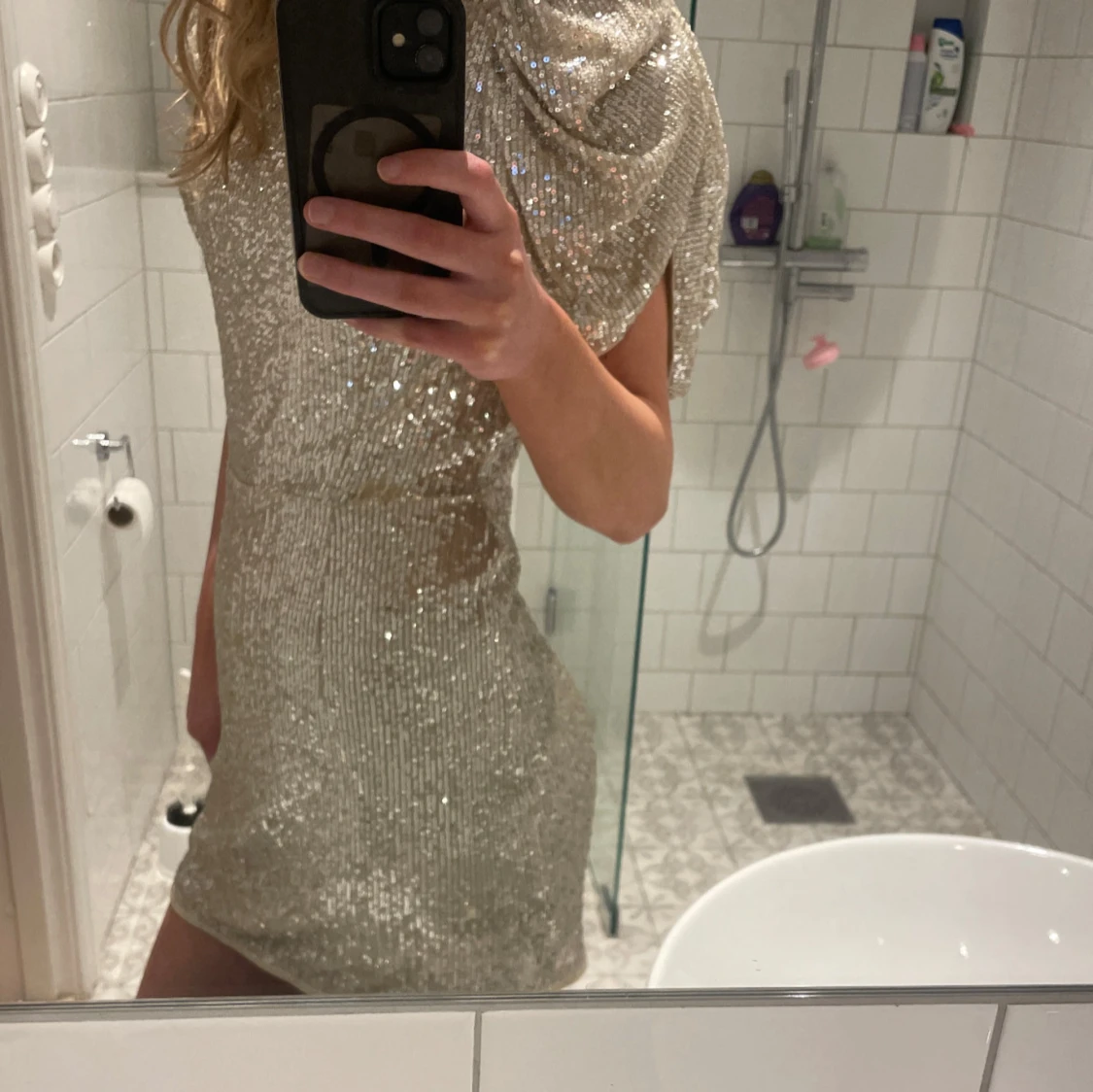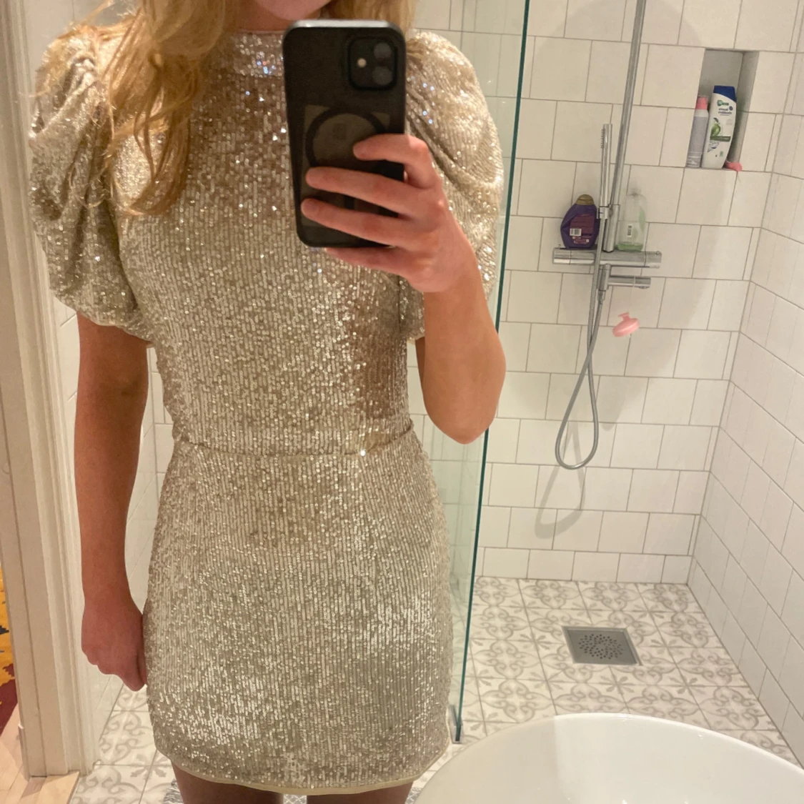 Säljer en superfin glittrig kortklänning i ljus champagnefärg med puffärmar och draperad rygg. Klänningen har tight passform och är täckt av paljetter, perfekt för fest eller nyår. Hög halsringning och markerad midja ger en snygg siluett.