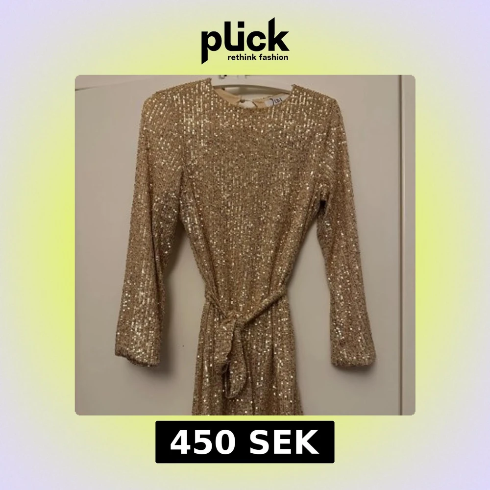 Snygg glittrig guldklänning med trekvartsärm och knytband i midjan. Perfekt för en festlig kväll med stil. Klänningen har en elegant passform och är tillverkad i ett glittrande material som fångar ljuset vackert.