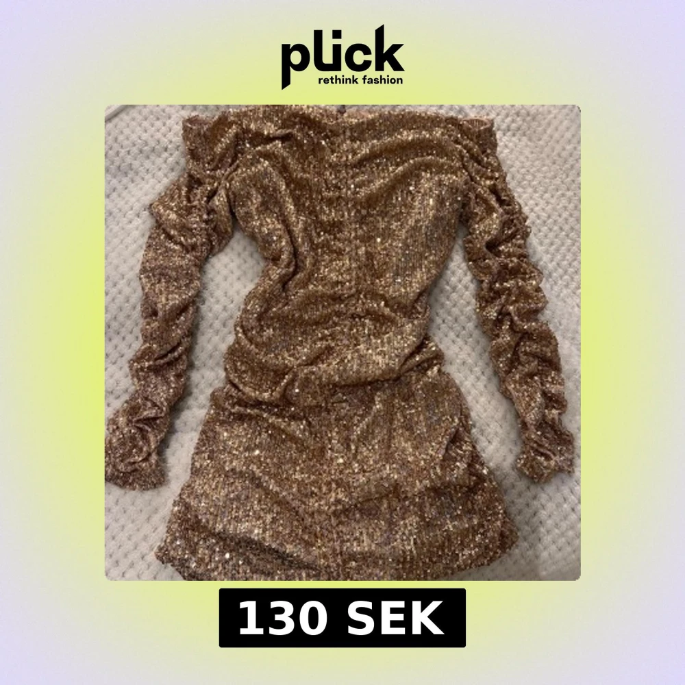 Säljer en glittrig guldklänning från Zara med långa ärmar och offshoulder-design. Klänningen har en åtsittande passform och är täckt med paljetter som ger en festlig look. Perfekt för en kväll ute eller speciella tillfällen.