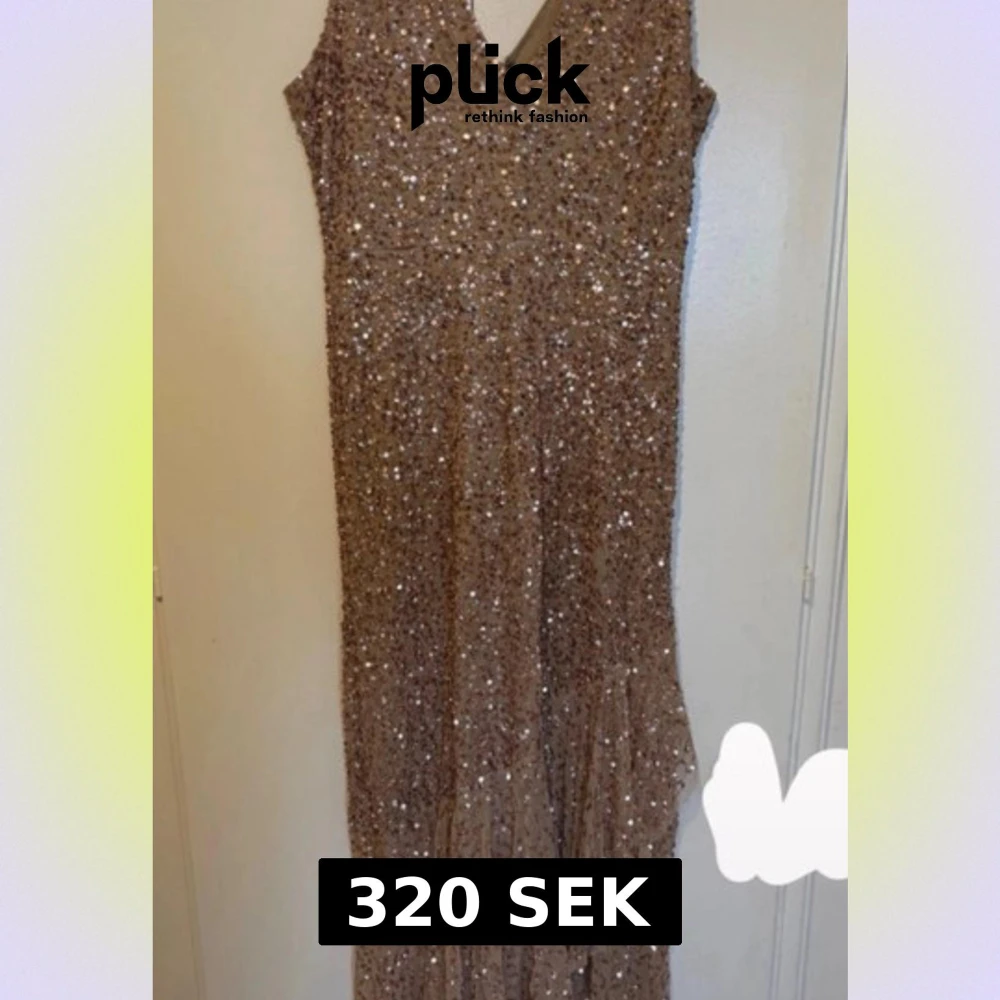 Glittrig klänning i champagne/guldton med paljetter. Använd men i fint skick. Några paljetter har lossnat här och där samt tråd som har släppts men inget som stör.