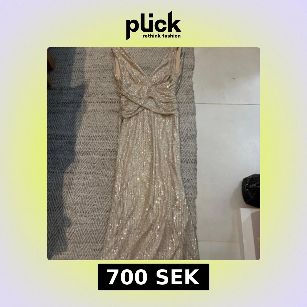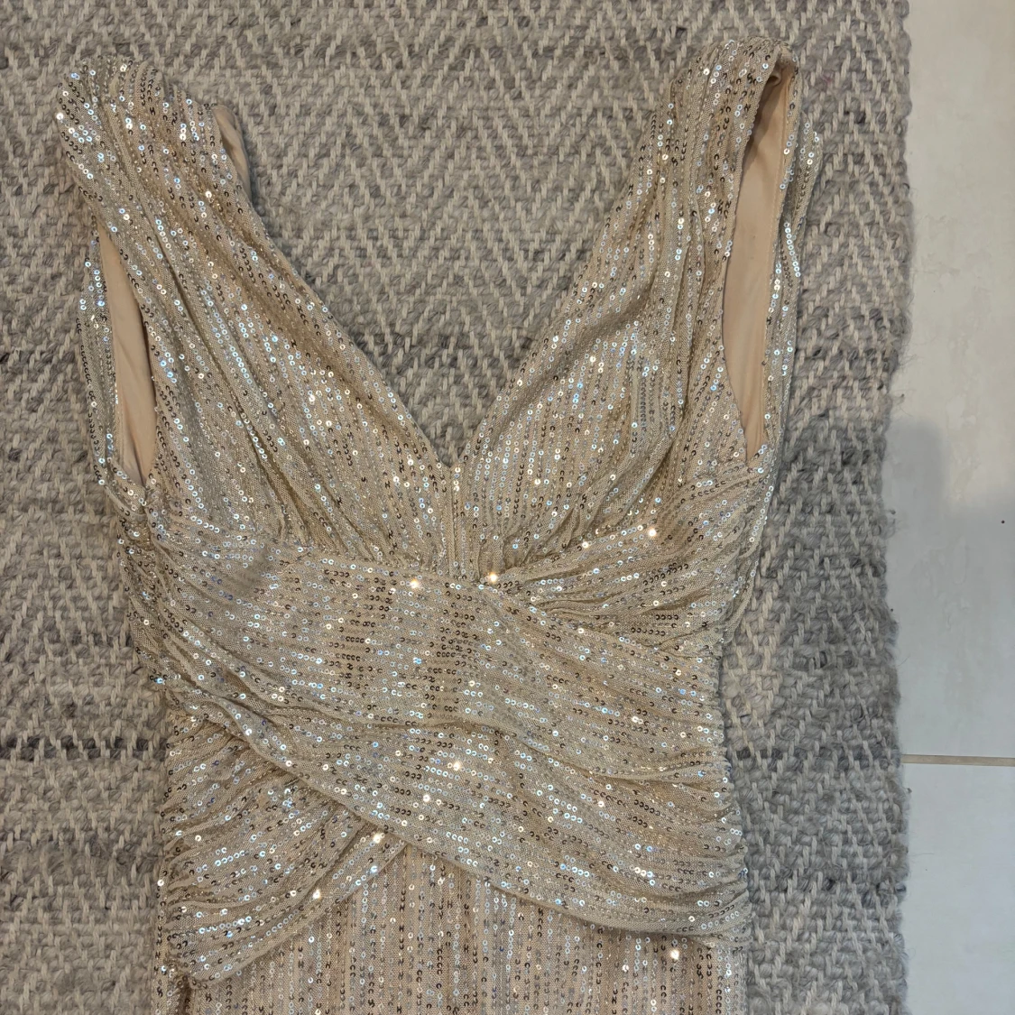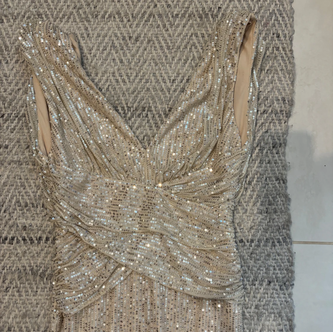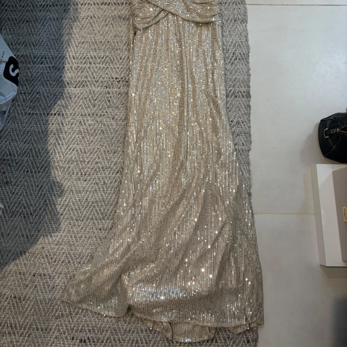 Säljer en fantastisk långklänning i champagnefärg med glittriga paljetter och v-ringning. Klänningen har axelband och en snygg omlott-detalj framtill. Perfekt för er som har bal snart 💞💞💞 bara använd en gång.