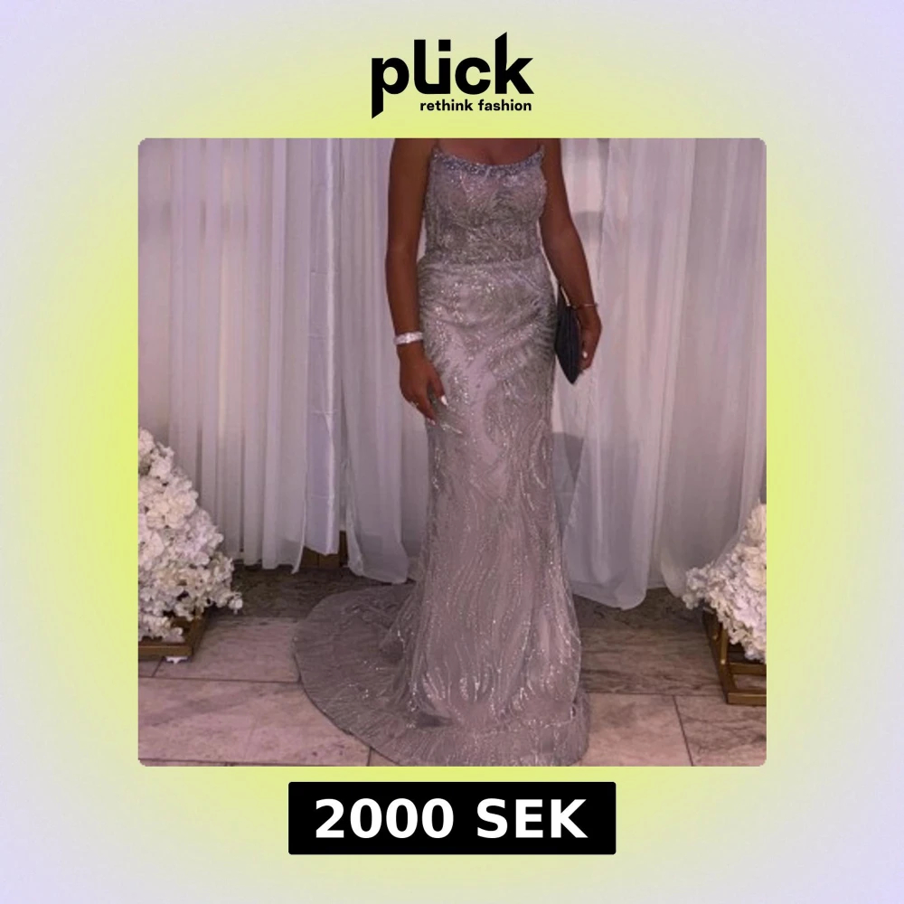 Säljer en magisk långklänning i silver med glittriga detaljer och mönster. Klänningen har en figurnära passform, smala axelband och en elegant släp. Materialet är skimrande och ger en lyxig känsla, perfekt för bal eller fest.