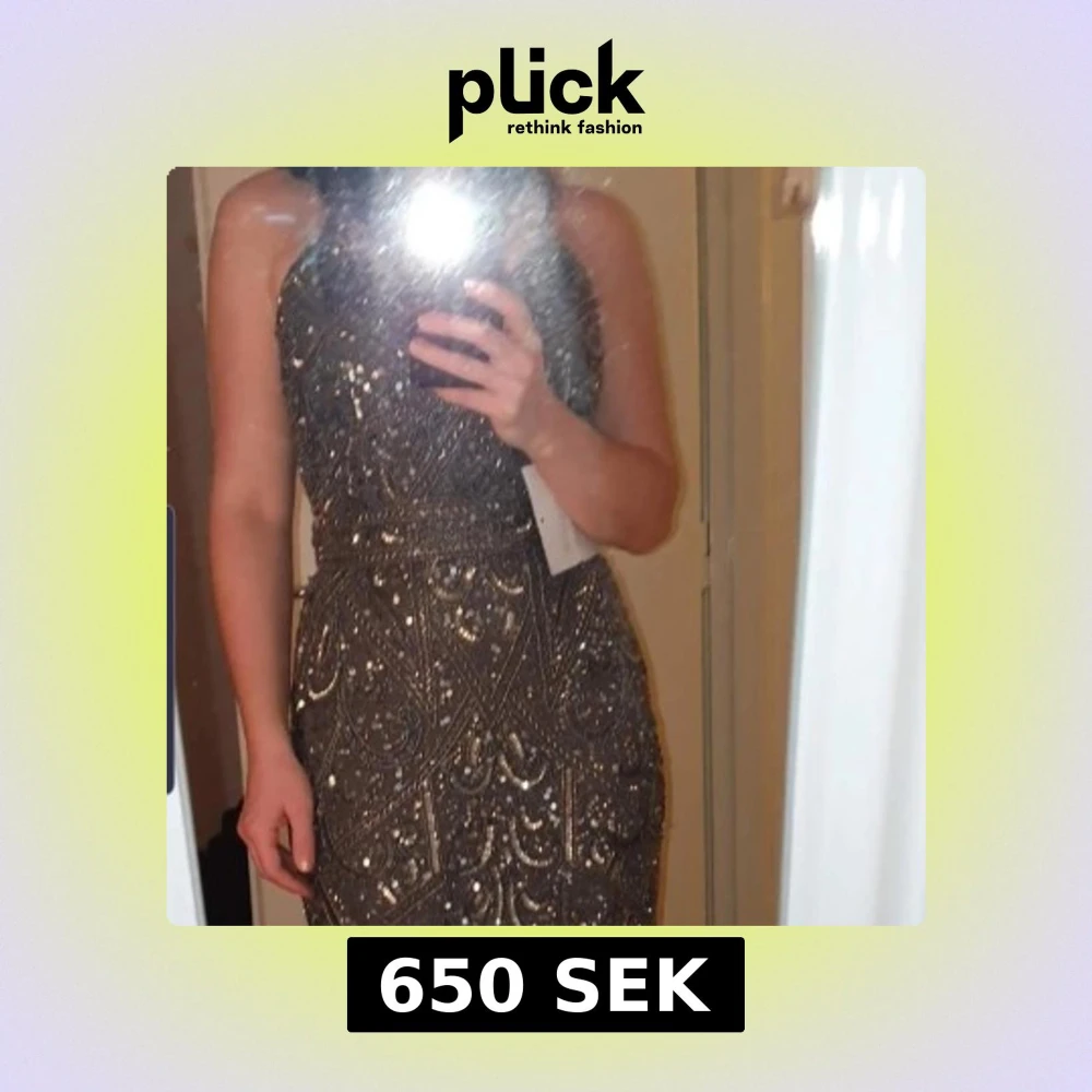 Snygg glittrig långklänning med intrikata paljettmönster. Klänningen har smala axelband och en v-ringad.
