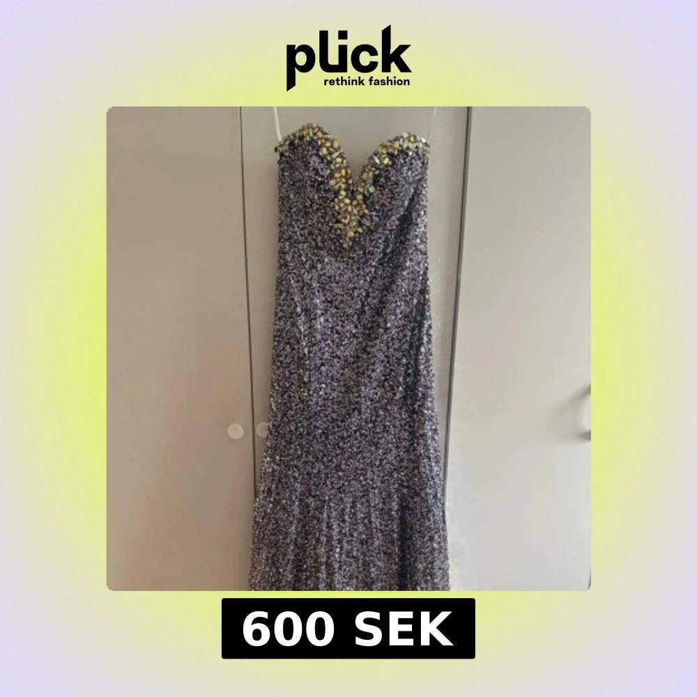 Supersnygg långklänning med massor av glittrande paljetter i silver och lila. Klänningen är axelbandslös med hjärtformad urringning och dekorerad med stora stenar upptill. Perfekt för bal eller fest där du vill sticka ut. Klänningen är i storlek US 12