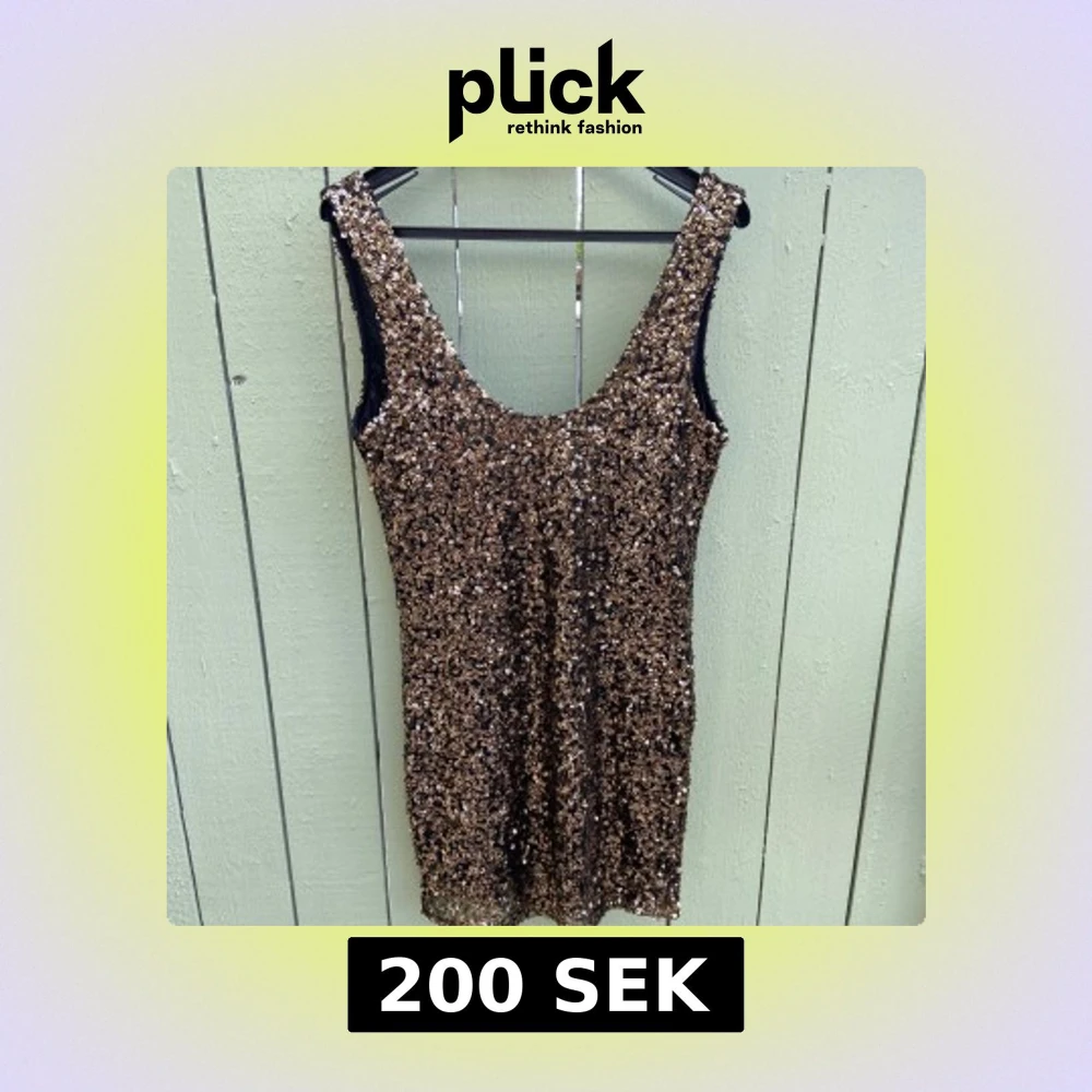 Supersnygg kort klänning täckt av guldiga paljetter med djup rundringning både fram och bak. Ärmlös modell som sitter tight och ger en riktigt festlig look. Perfekt för dig som vill sticka ut och glänsa hela kvällen.det står L på den men passar även M . Hämtas i norsborg botkyrka.