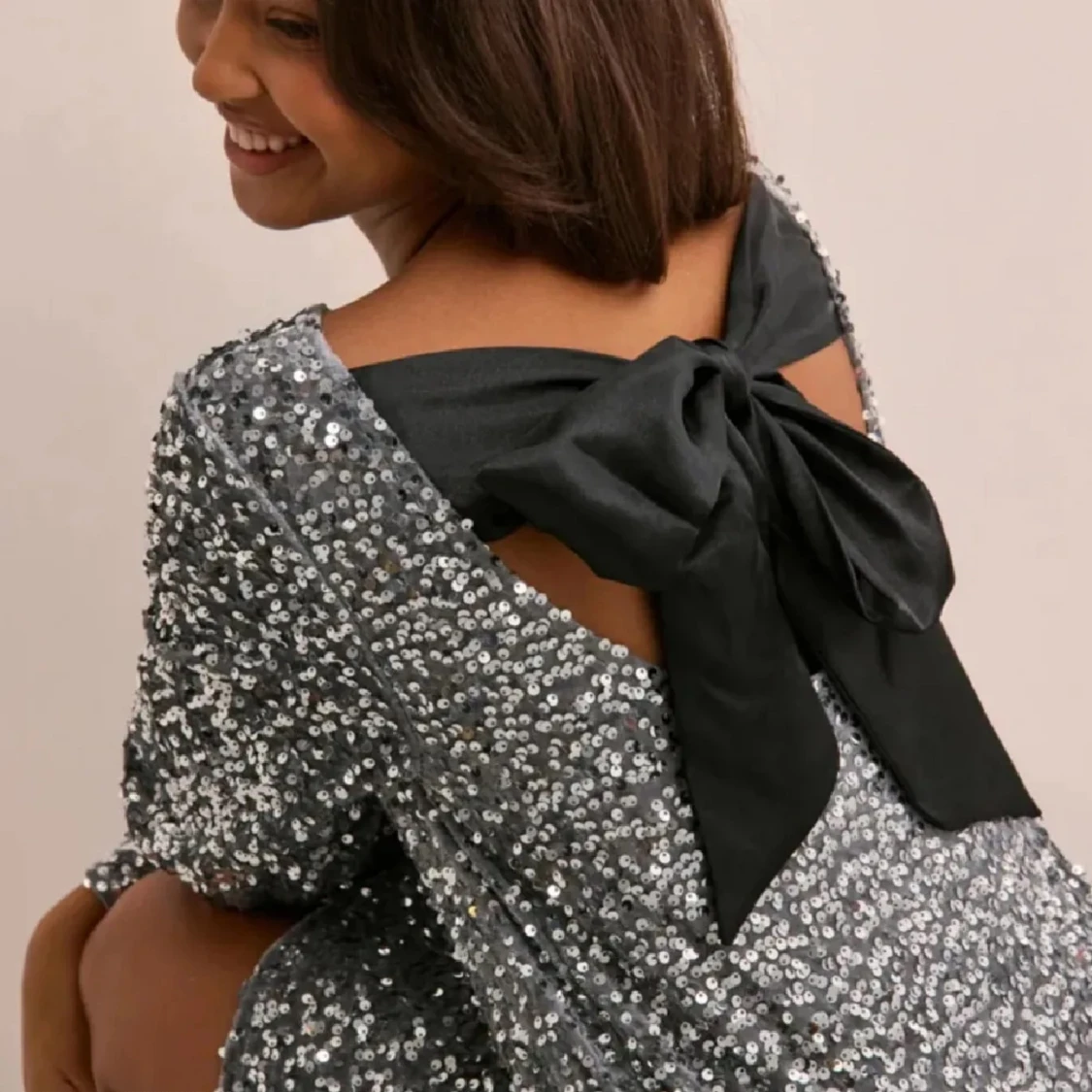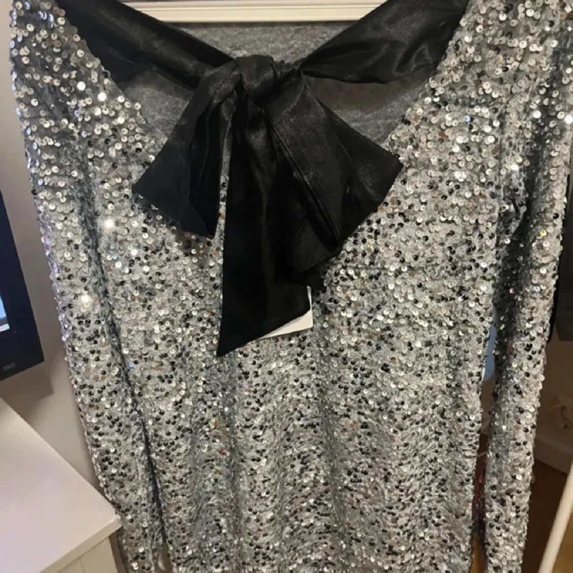 Snygg glittrig klänning i silver med en stor svart rosett i ryggen. Klänningen har långa ärmar och en öppen rygg. Helt ny, med prislappen kvar💕☺️